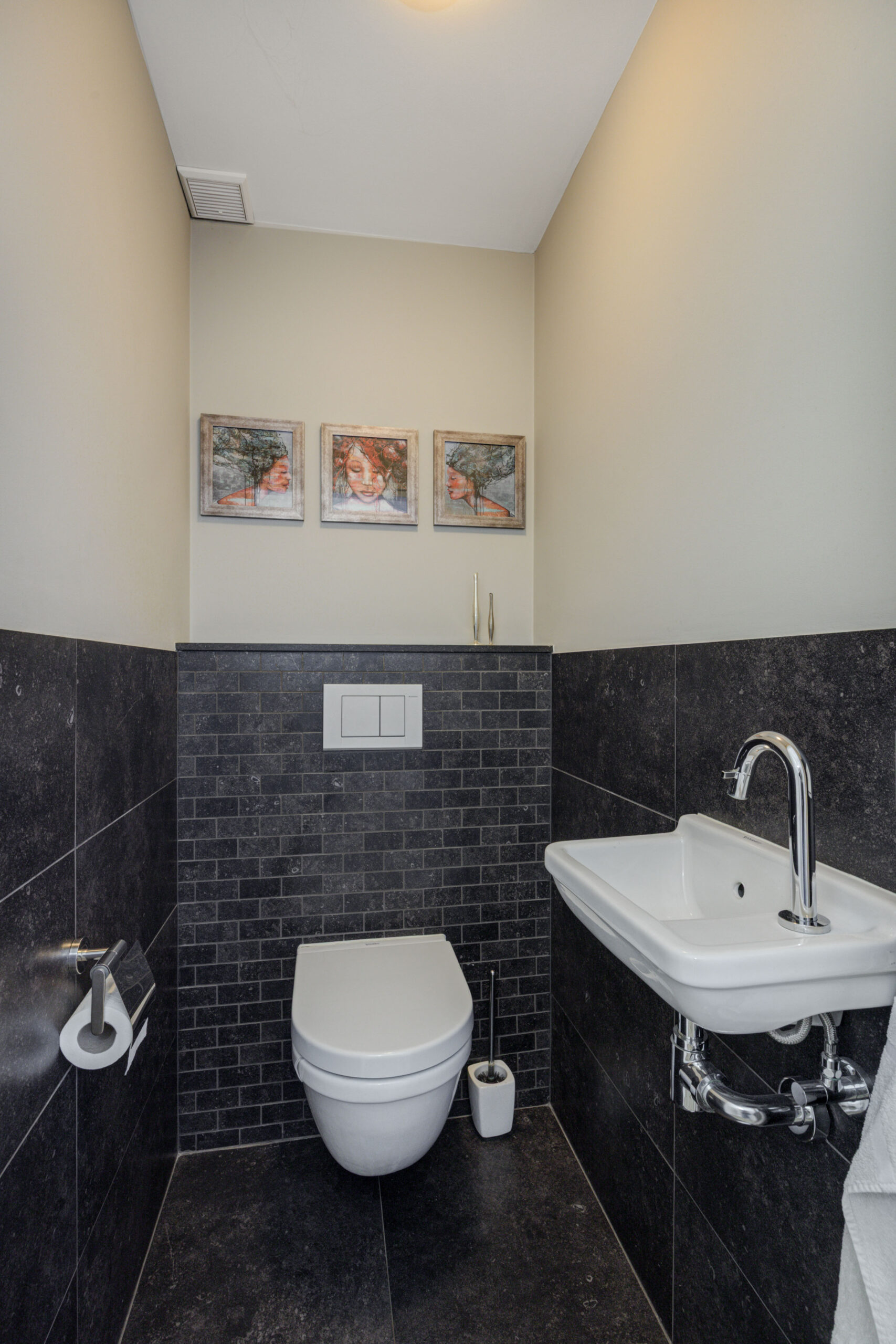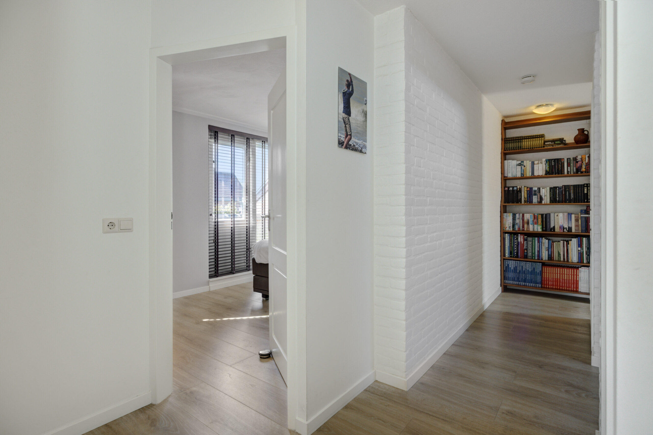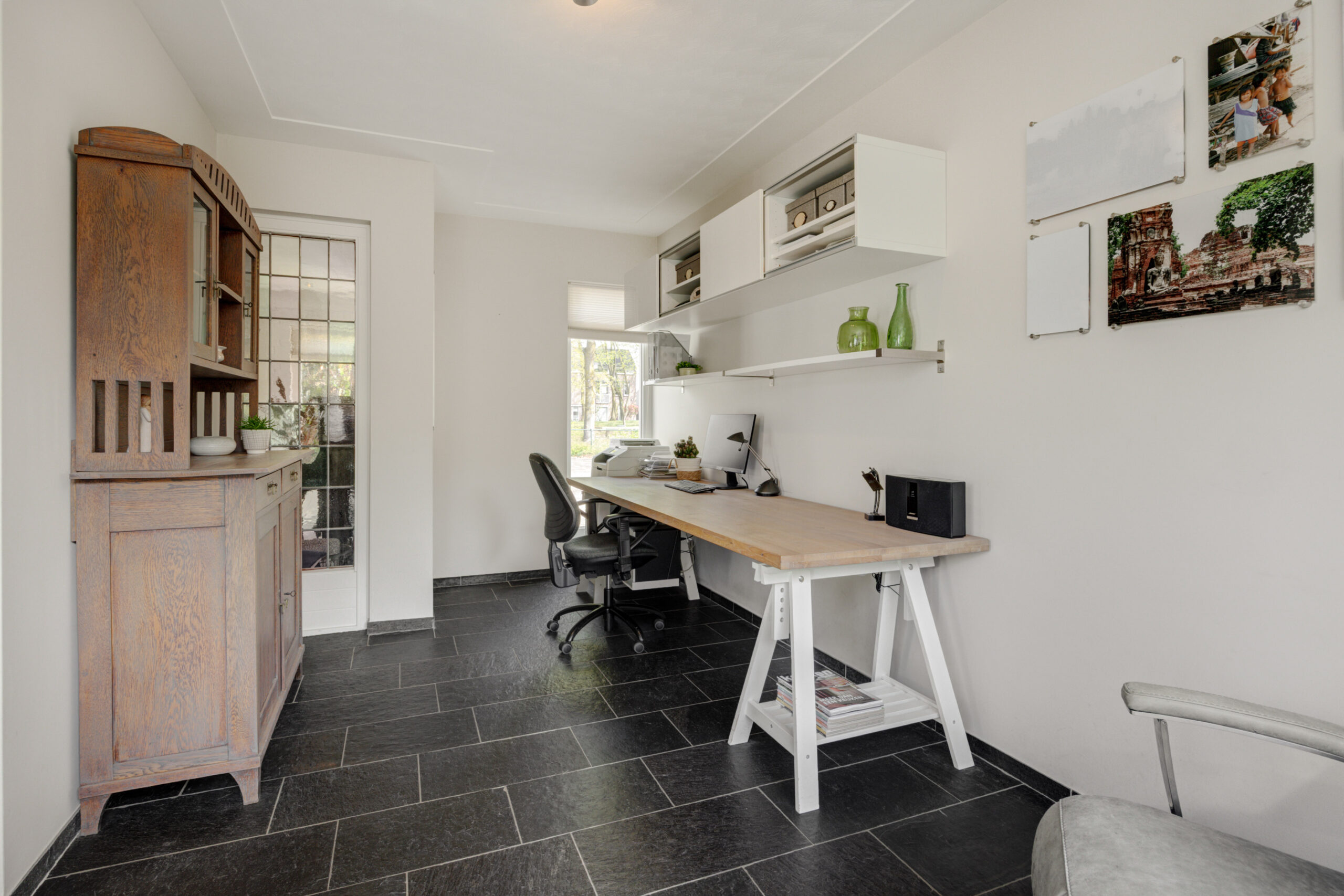 De begane grond is afgewerkt met een Noorse leisteenvloer met vloerverwarming (m.u.v. de bijkeuken en garage), wat zorgt voor comfort en een rustige, luxe uitstraling. Verder vind je hier een bijkeuken met toegang tot de inpandige garage en een extra kamer die perfect te gebruiken is als kantoor of speelruimte. Ook de hal verdient een vermelding, met het fraaie glas-in-lood dat direct bij binnenkomst voor een karaktervolle uitstraling zorgt. De woning is bovendien goed onderhouden en netjes afgewerkt, waardoor je hier zo in kunt.