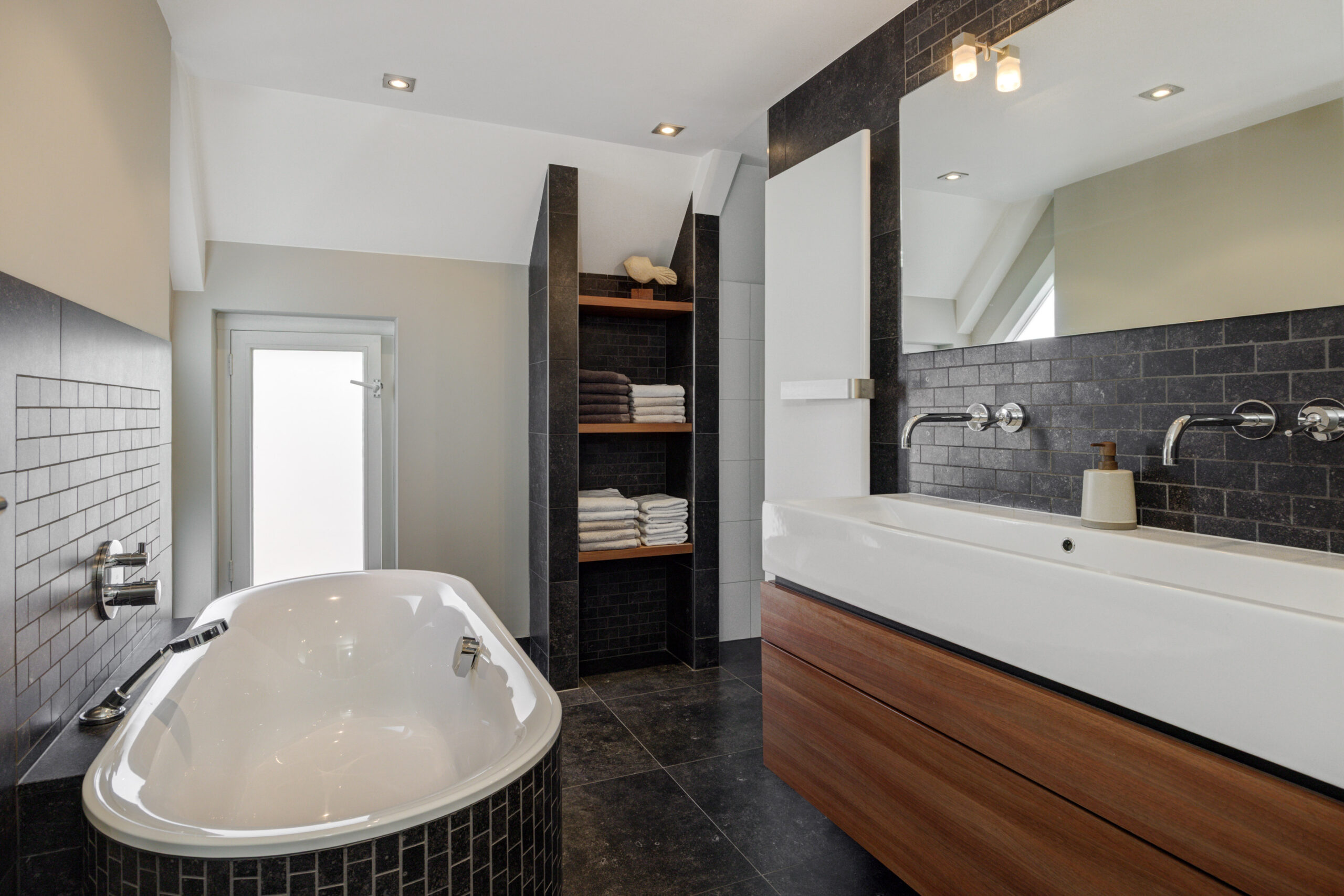 – Luxe badkamer met inloopdouche, ligbad, dubbele wastafel en designradiator.