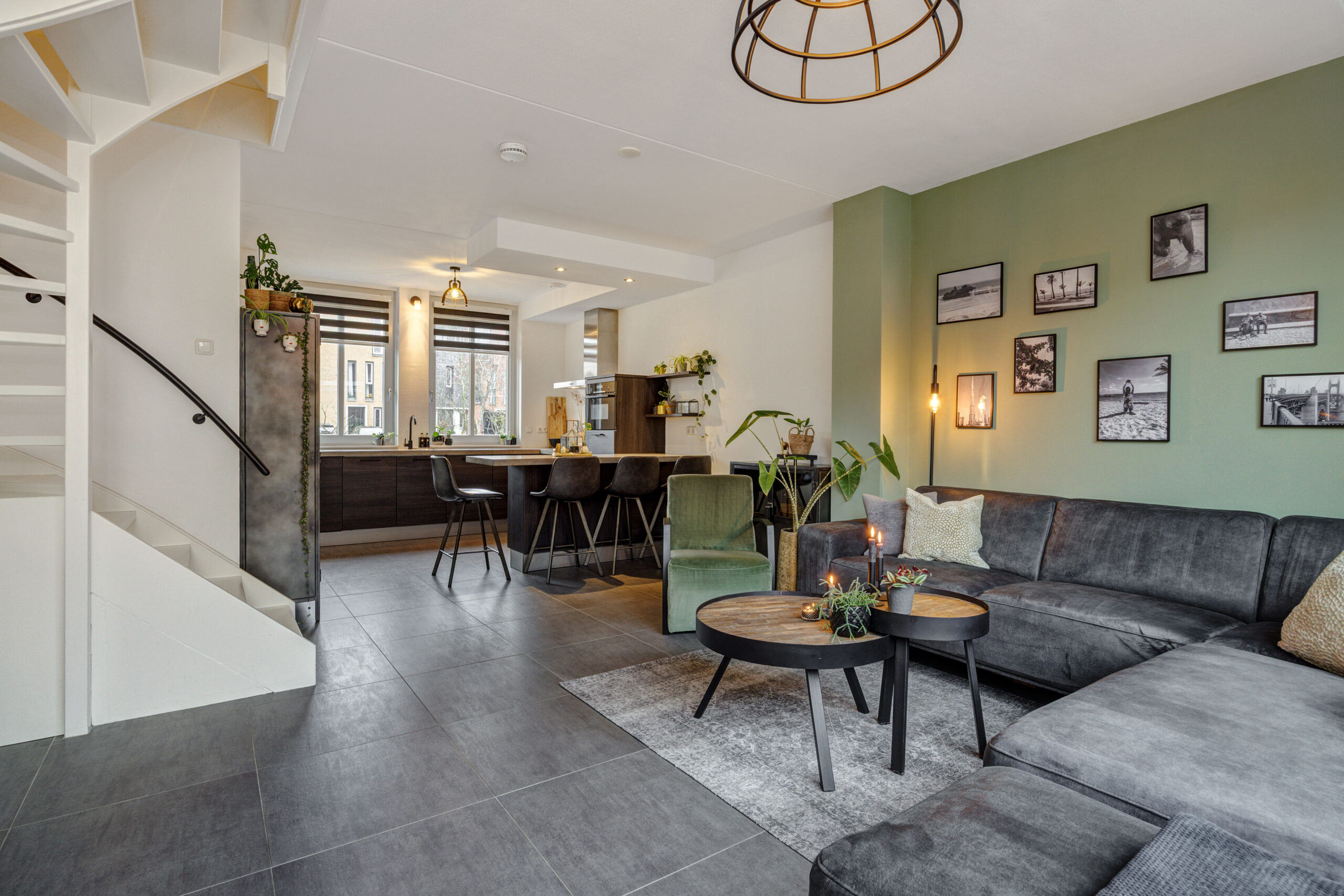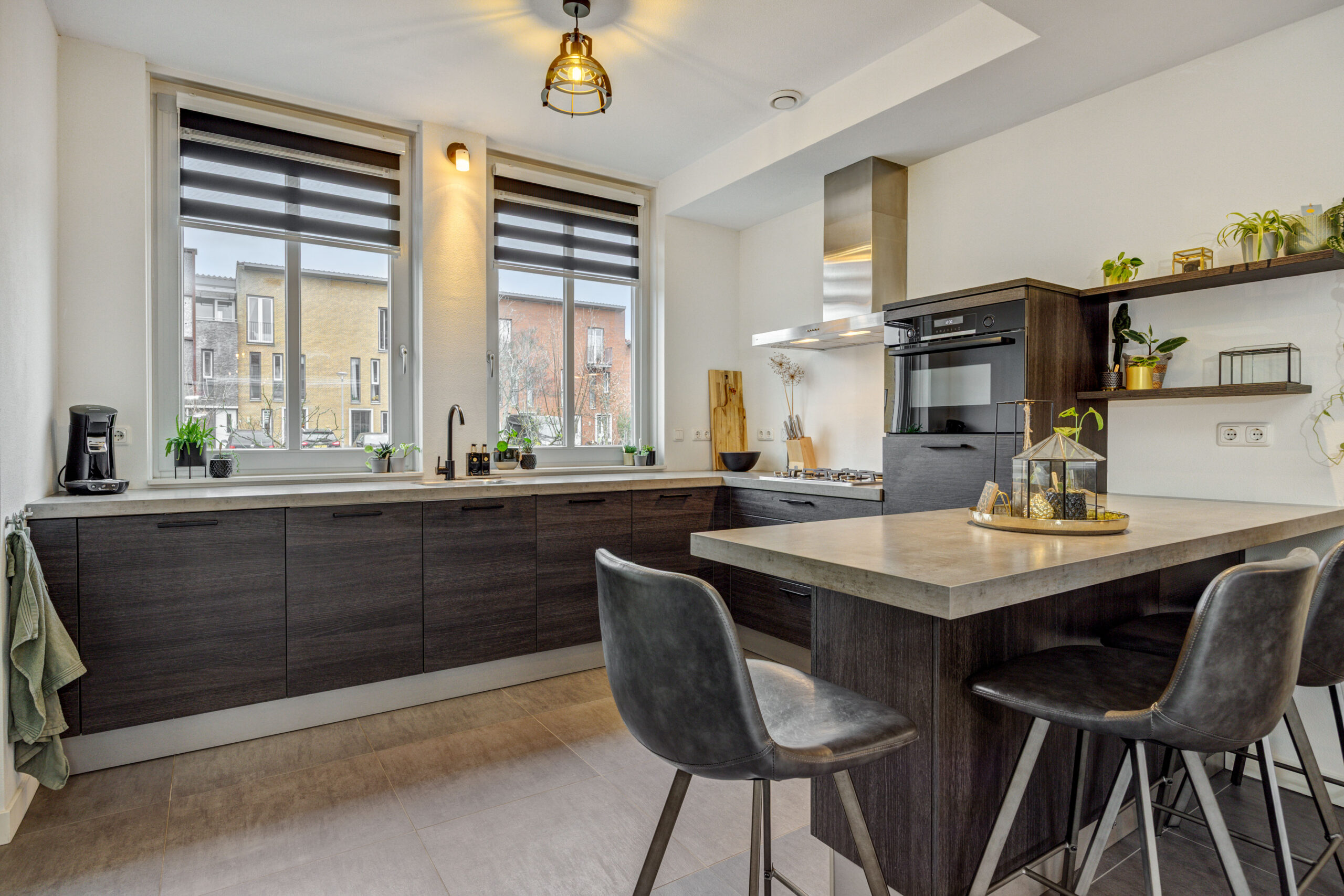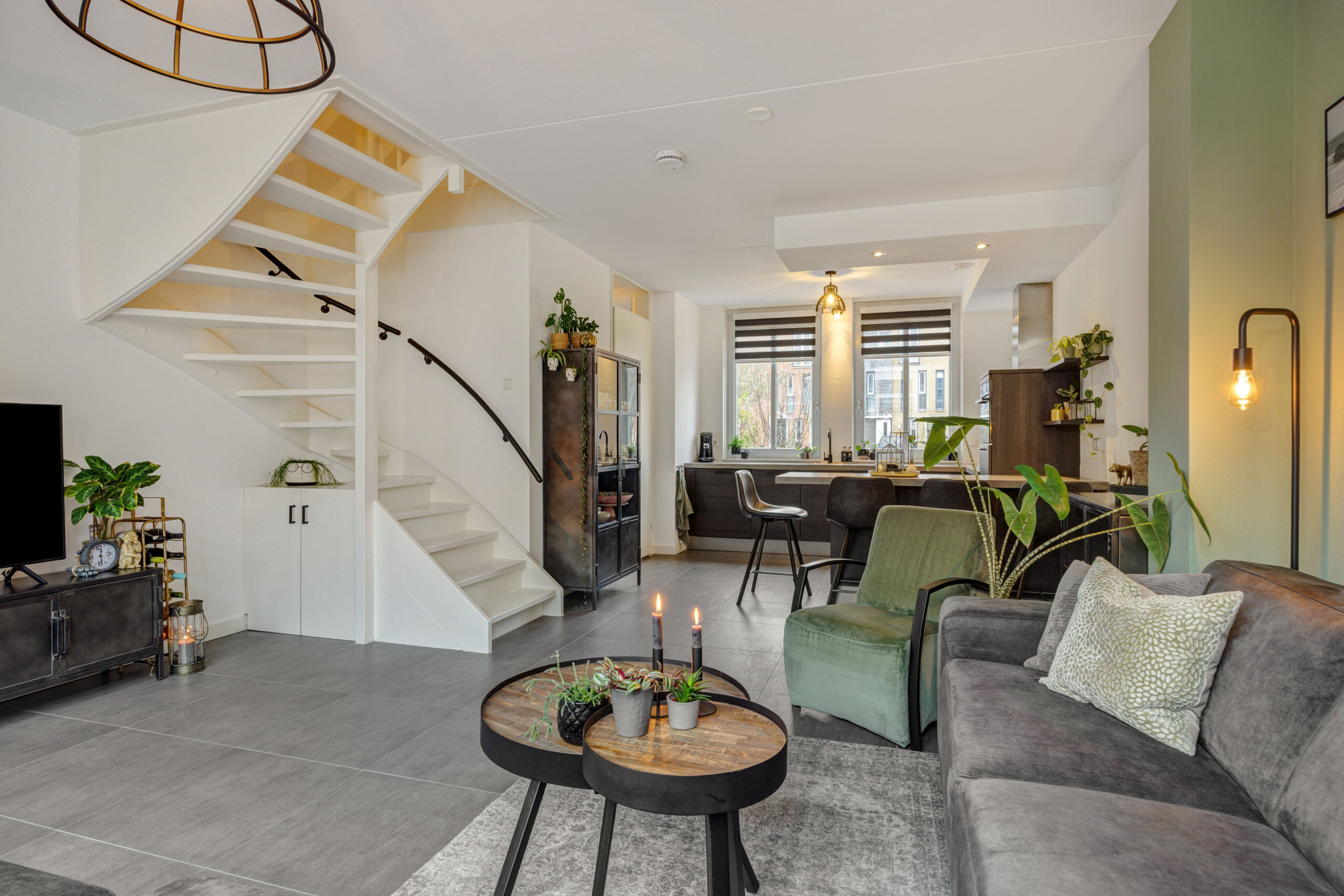 Bij binnenkomst is het de stijlvolle open keuken die meteen indruk maakt. Deze is opgesteld in een royale U-vorm, waarbij het betonlook werkblad naadloos doorloopt als eettafel. Een fijne plek voor een snel ontbijt, een borrel of een lange avond tafelen. Uiteraard is de keuken compleet uitgerust met inbouwapparatuur zoals een gaskookplaat met RVS afzuigkap, vaatwasser en koelkast. De woonkamer sluit hier mooi op aan en biedt volop ruimte voor een comfortabele zithoek. Grote raampartijen en de deur naar het terras zorgen voor veel daglicht en een prettige verbinding met buiten. De trap in de hoek geeft de ruimte een speels en open karakter. Op de hele begane grond ligt een antracietgrijze keramische tegelvloer met vloerverwarming.