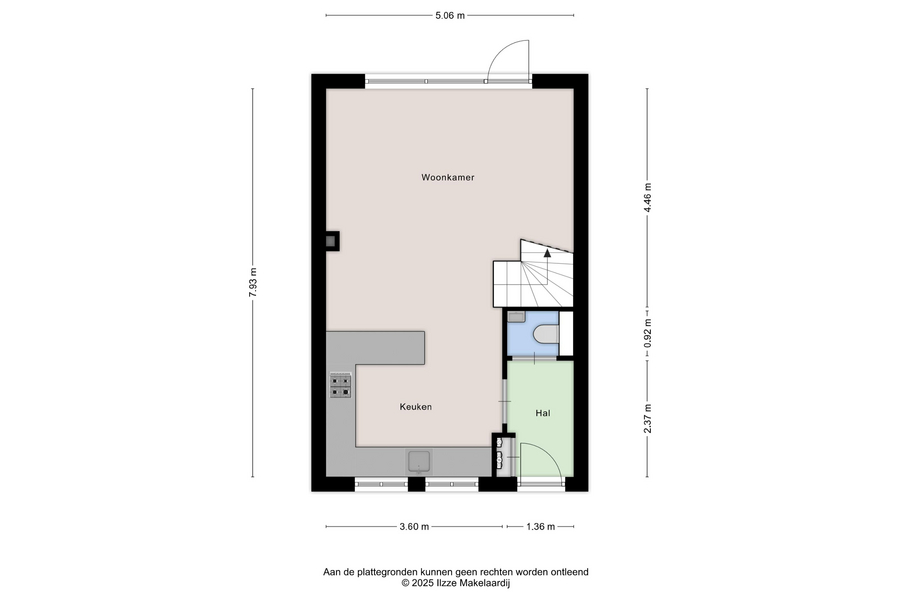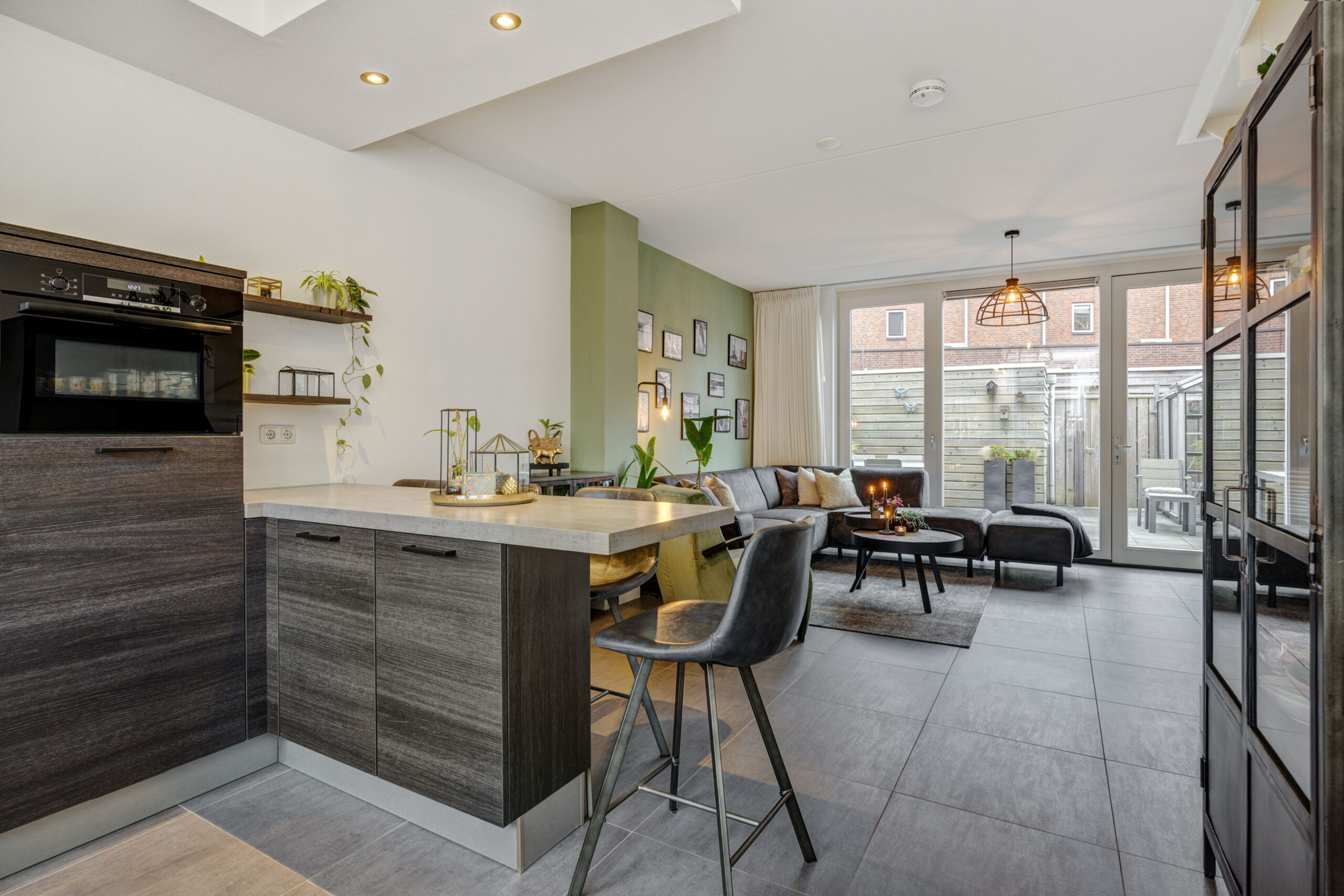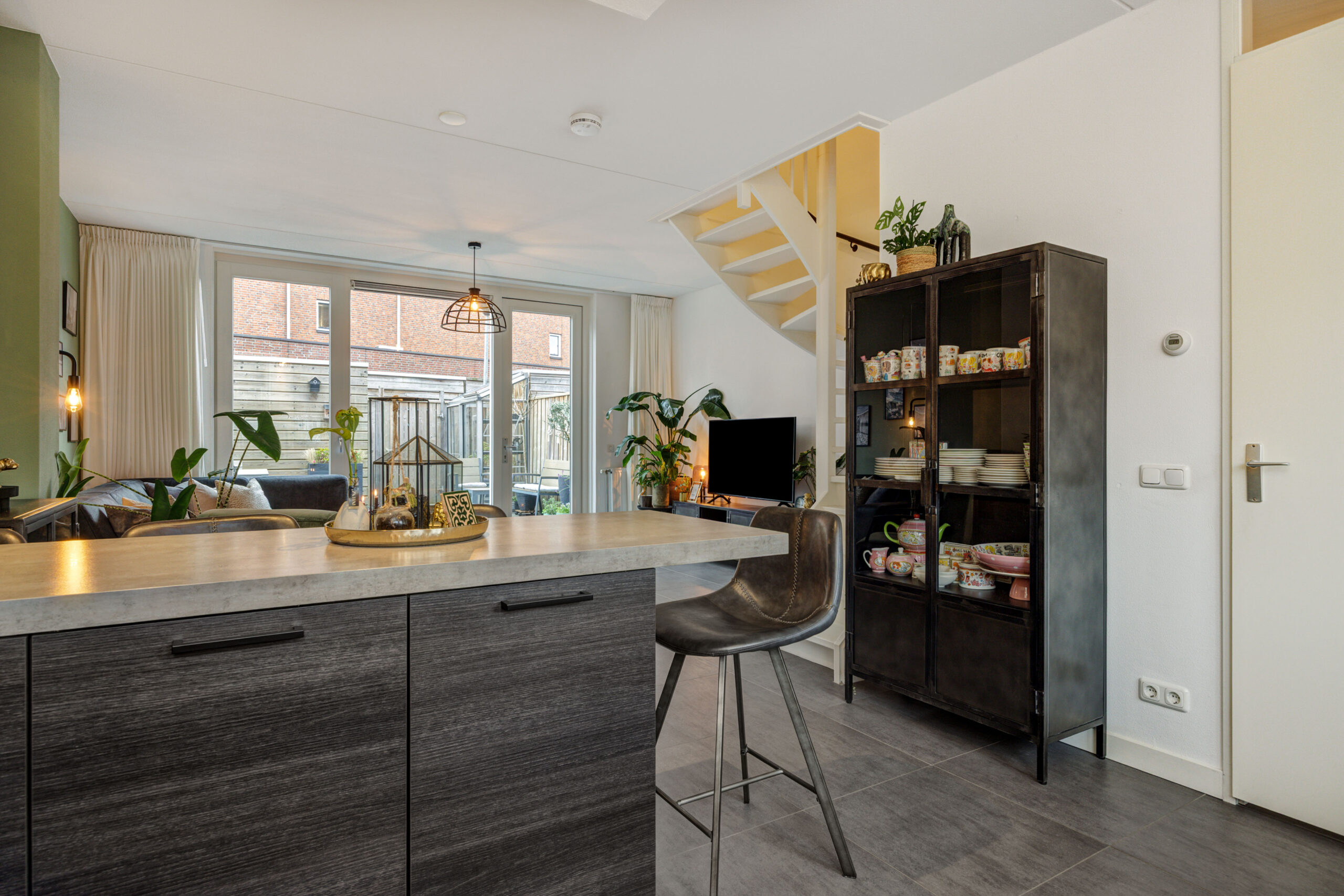 Bij binnenkomst is het de stijlvolle open keuken die meteen indruk maakt. Deze is opgesteld in een royale U-vorm, waarbij het betonlook werkblad naadloos doorloopt als eettafel. Een fijne plek voor een snel ontbijt, een borrel of een lange avond tafelen. Uiteraard is de keuken compleet uitgerust met inbouwapparatuur zoals een gaskookplaat met RVS afzuigkap, vaatwasser en koelkast. De woonkamer sluit hier mooi op aan en biedt volop ruimte voor een comfortabele zithoek. Grote raampartijen en de deur naar het terras zorgen voor veel daglicht en een prettige verbinding met buiten. De trap in de hoek geeft de ruimte een speels en open karakter. Op de hele begane grond ligt een antracietgrijze keramische tegelvloer met vloerverwarming.