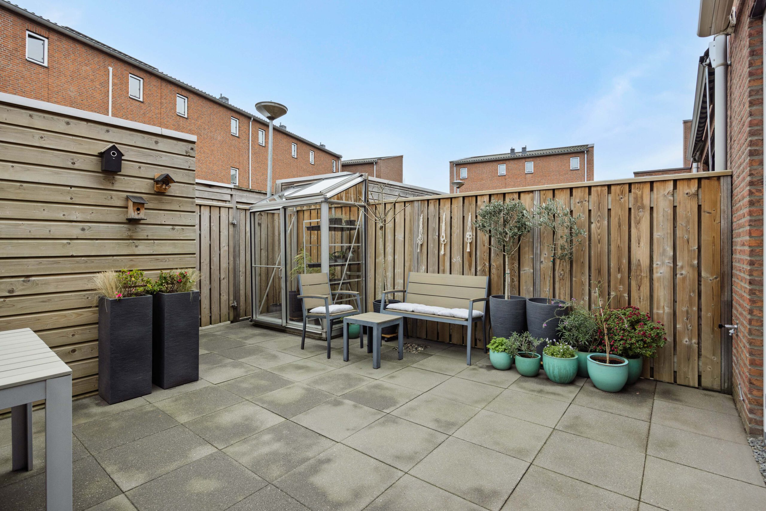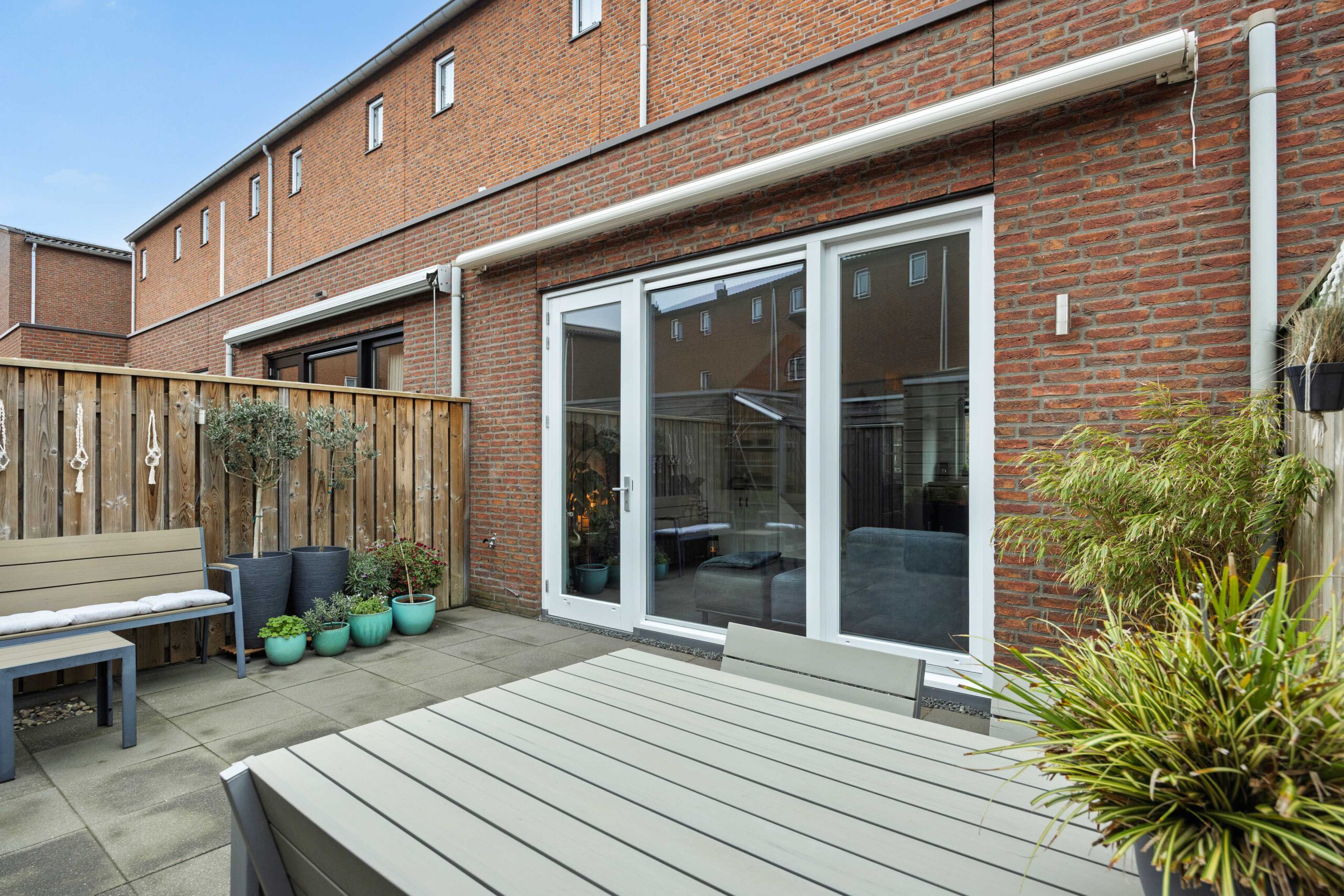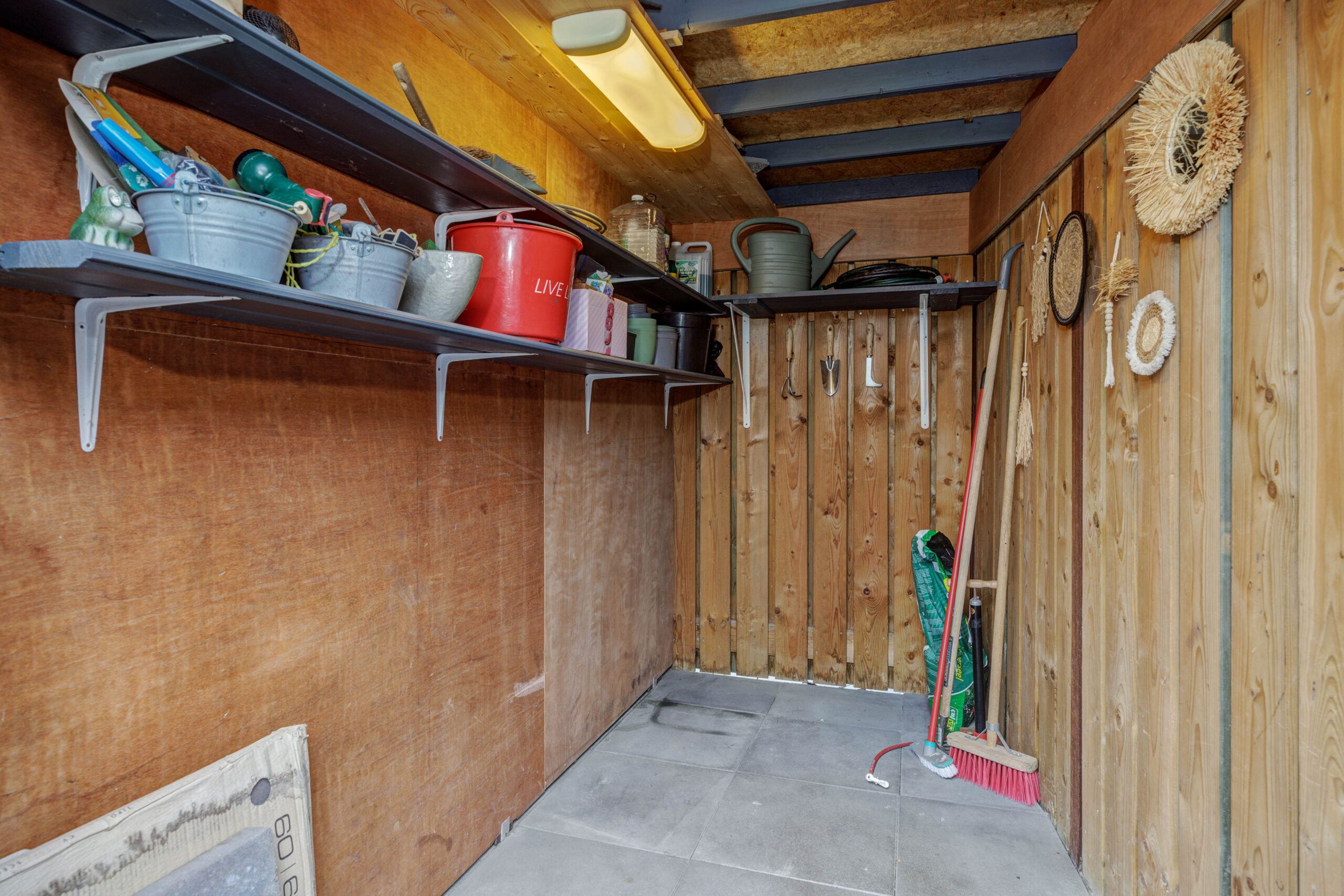 Buiten geniet je van een zonnige tuin op het zuiden. De tuin is compact maar slim ingedeeld, waardoor je hier heerlijk kunt ontspannen. Wordt het te warm, dan biedt het elektrische zonnescherm uitkomst. Achterin de tuin staat een handige berging voor de fietsen en via de achterom is de tuin goed bereikbaar.
