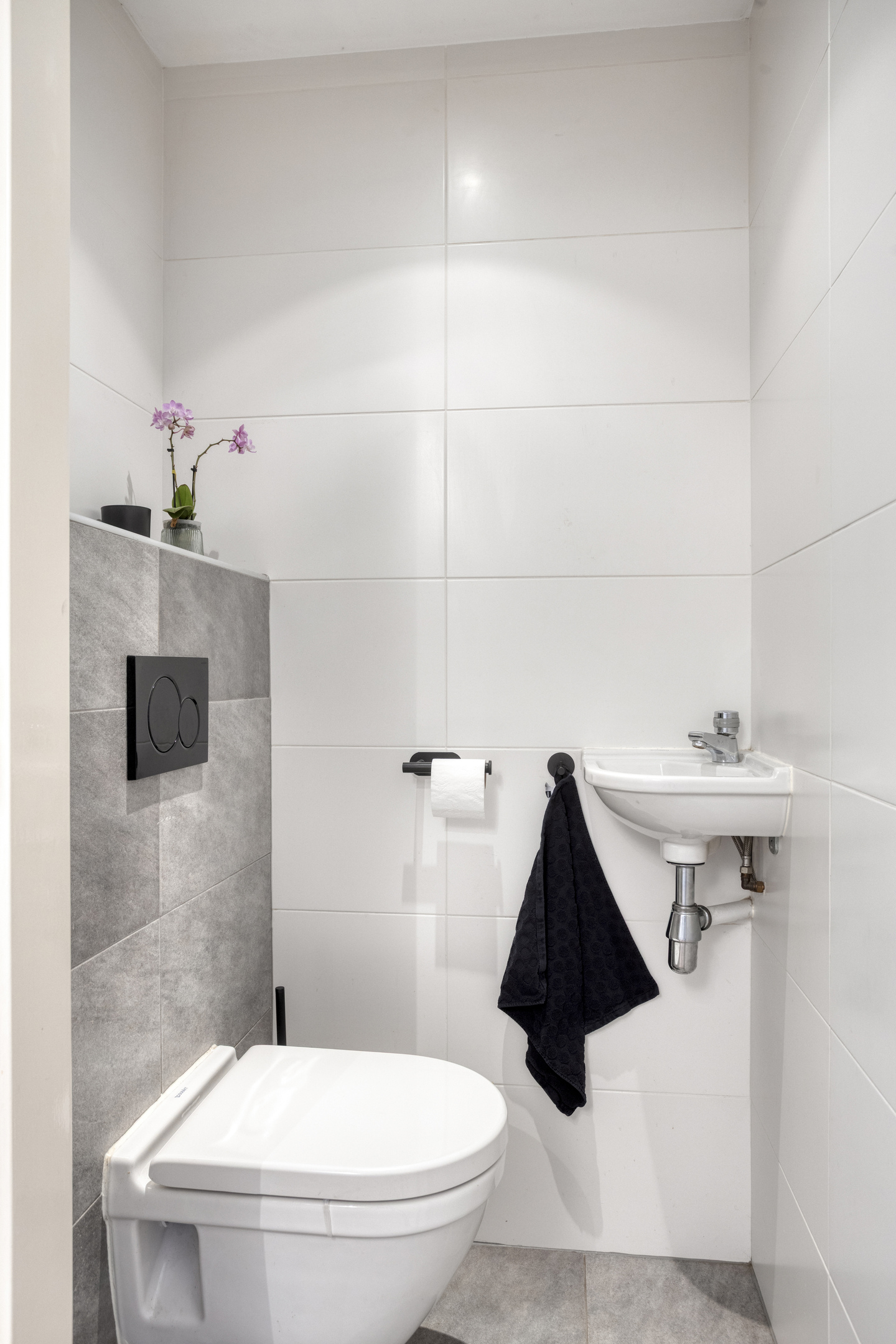 – Hal met meterkast, garderoberuimte en modern toilet met fonteintje.