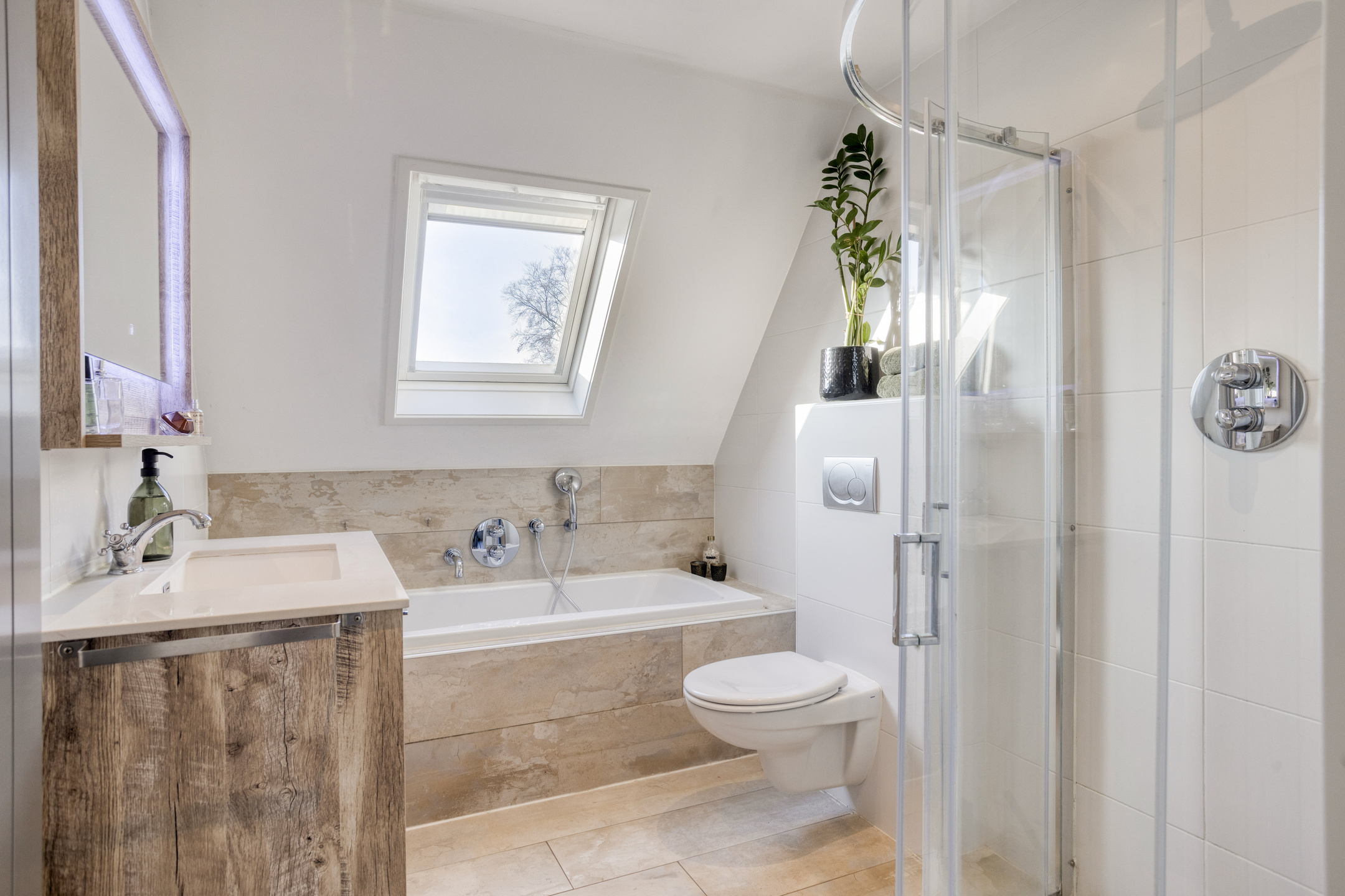 – Moderne badkamer met inloopdouche, ligbad, wastafelmeubel, toilet en designradiator.