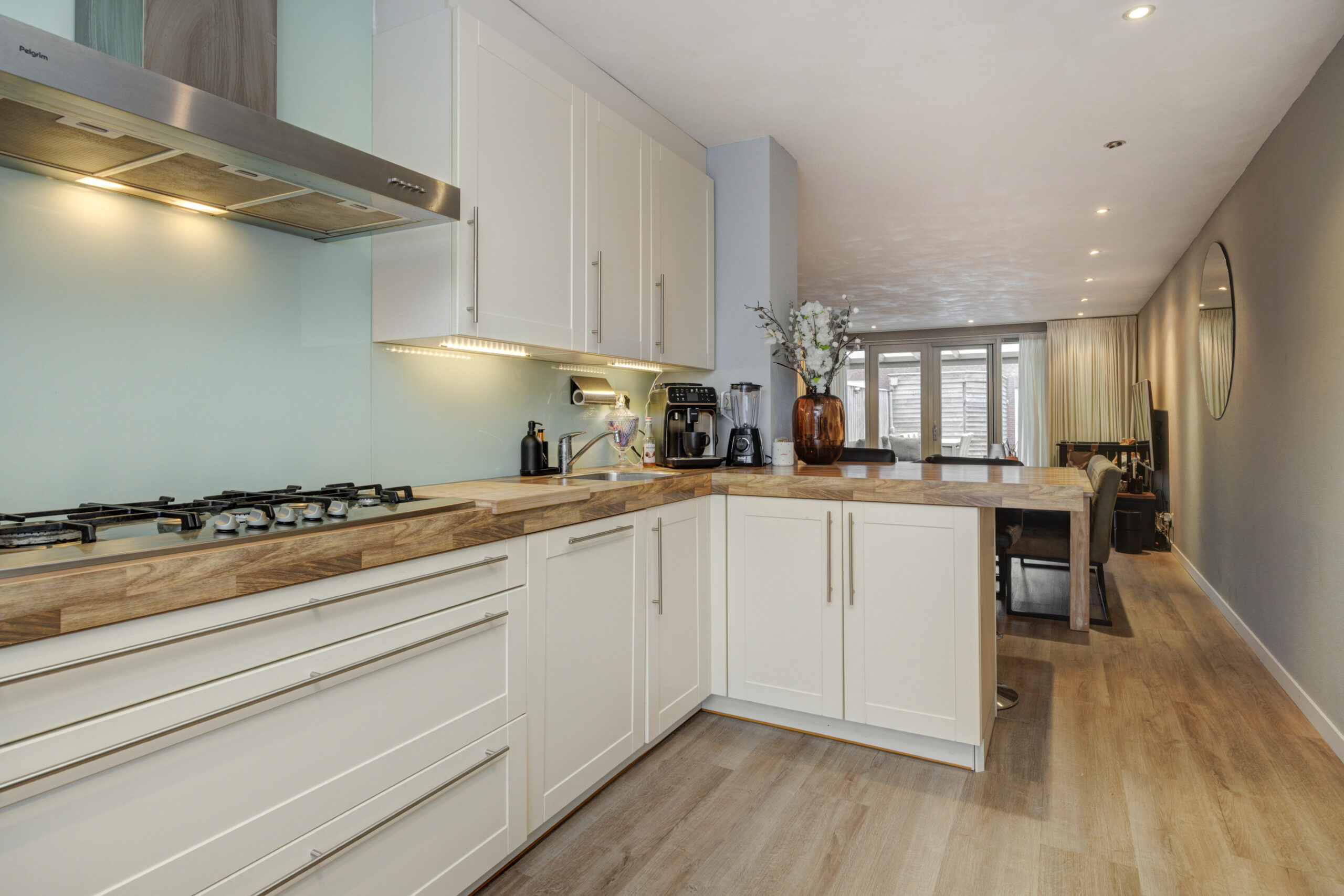 Bij binnenkomst valt direct op hoe ruim en open de begane grond is. De woonkamer is licht, sfeervol en biedt volop plek voor een fijne zithoek. Dankzij de openslaande deuren naar de overkapping lopen binnen en buiten mooi in elkaar over, waardoor je het hele jaar geniet van een heerlijke leefruimte. De open keuken ligt aan de voorzijde van de woning en is uitgerust met moderne inbouwapparatuur. Hier kook je met gemak een snelle maaltijd of een uitgebreid diner. Extra praktisch is de provisieruimte, ideaal voor voorraad of keukengerei die je uit het zicht wilt houden.