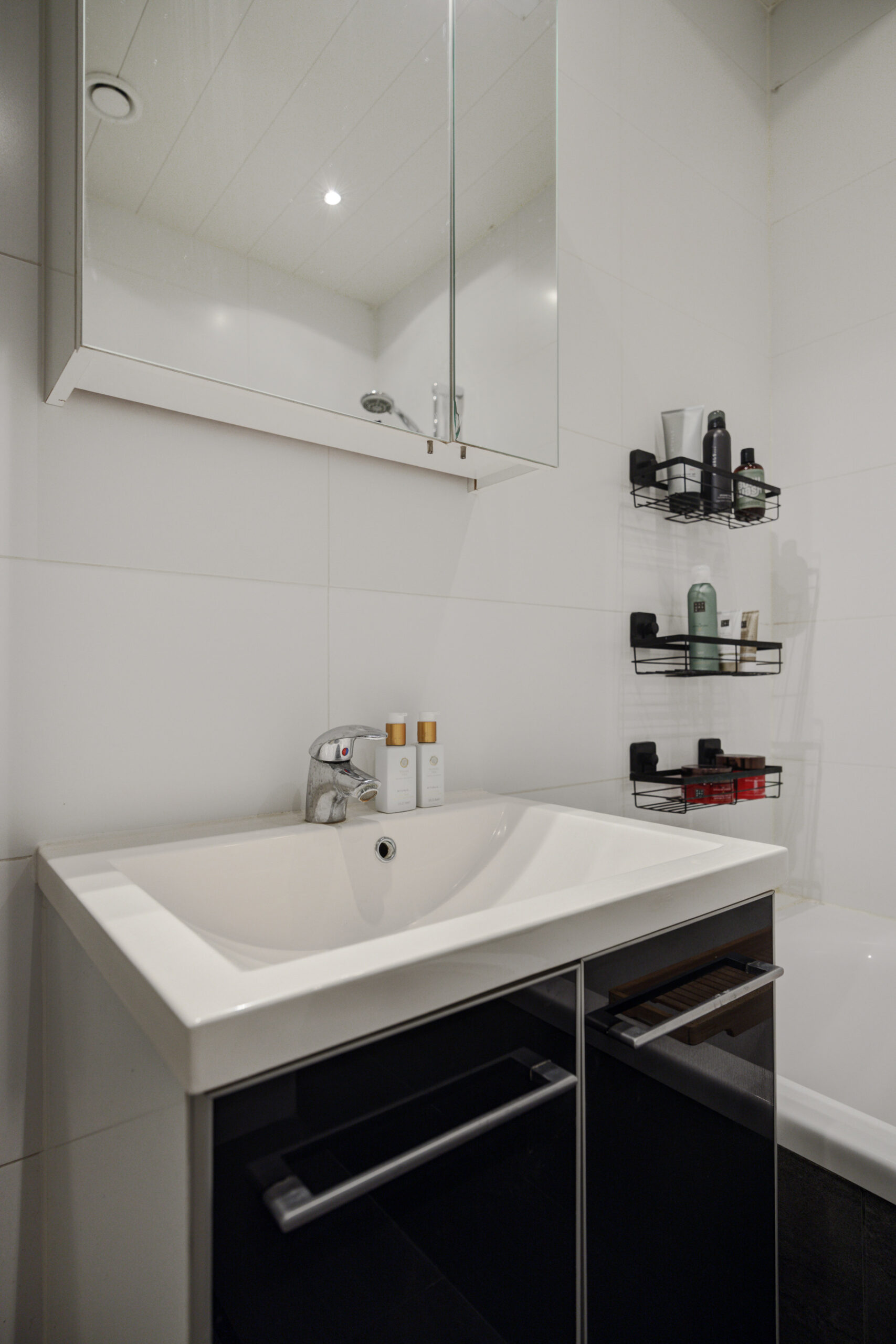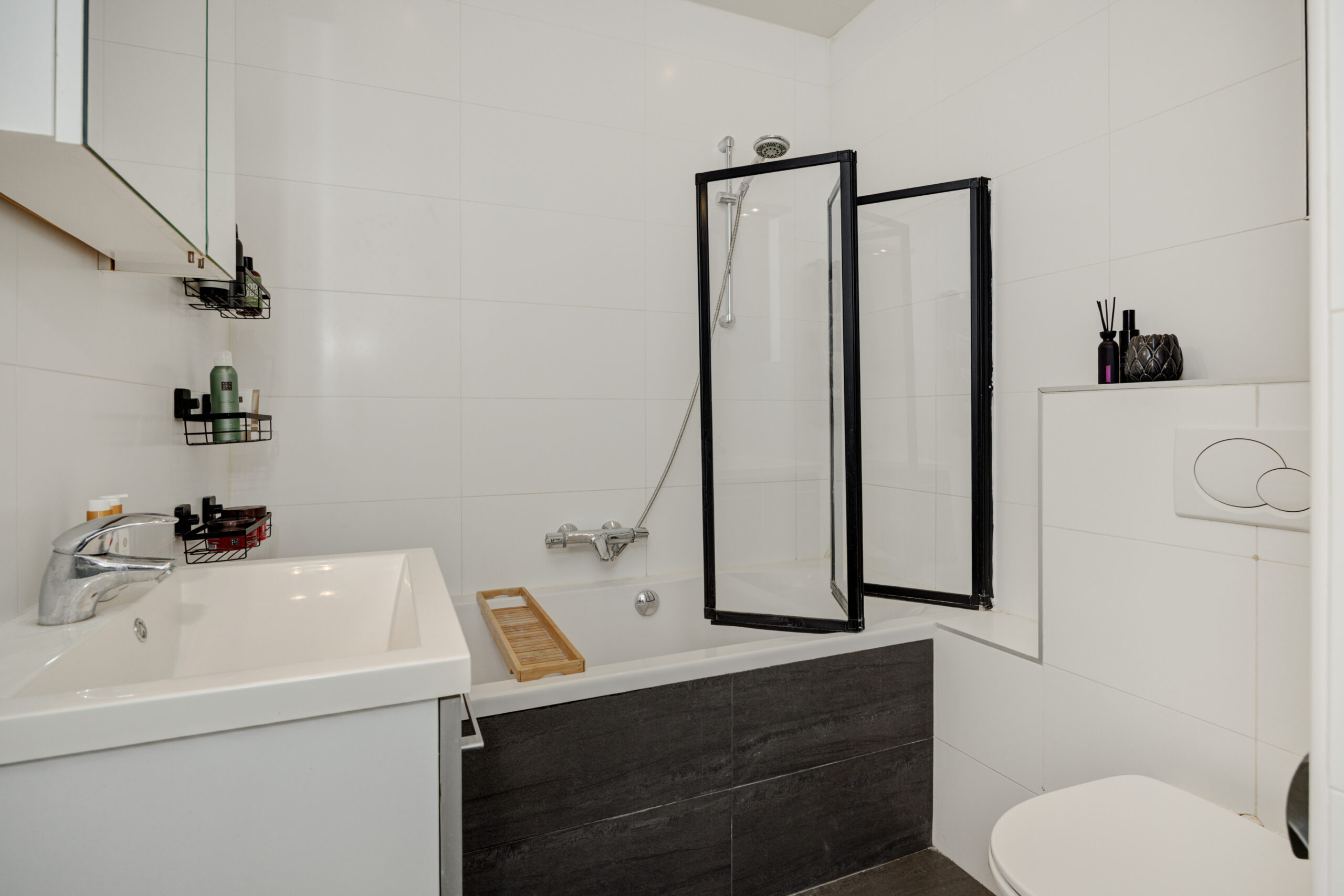 – Fraaie badkamer met bad, douche (in bad), wastafelmeubel en toilet.