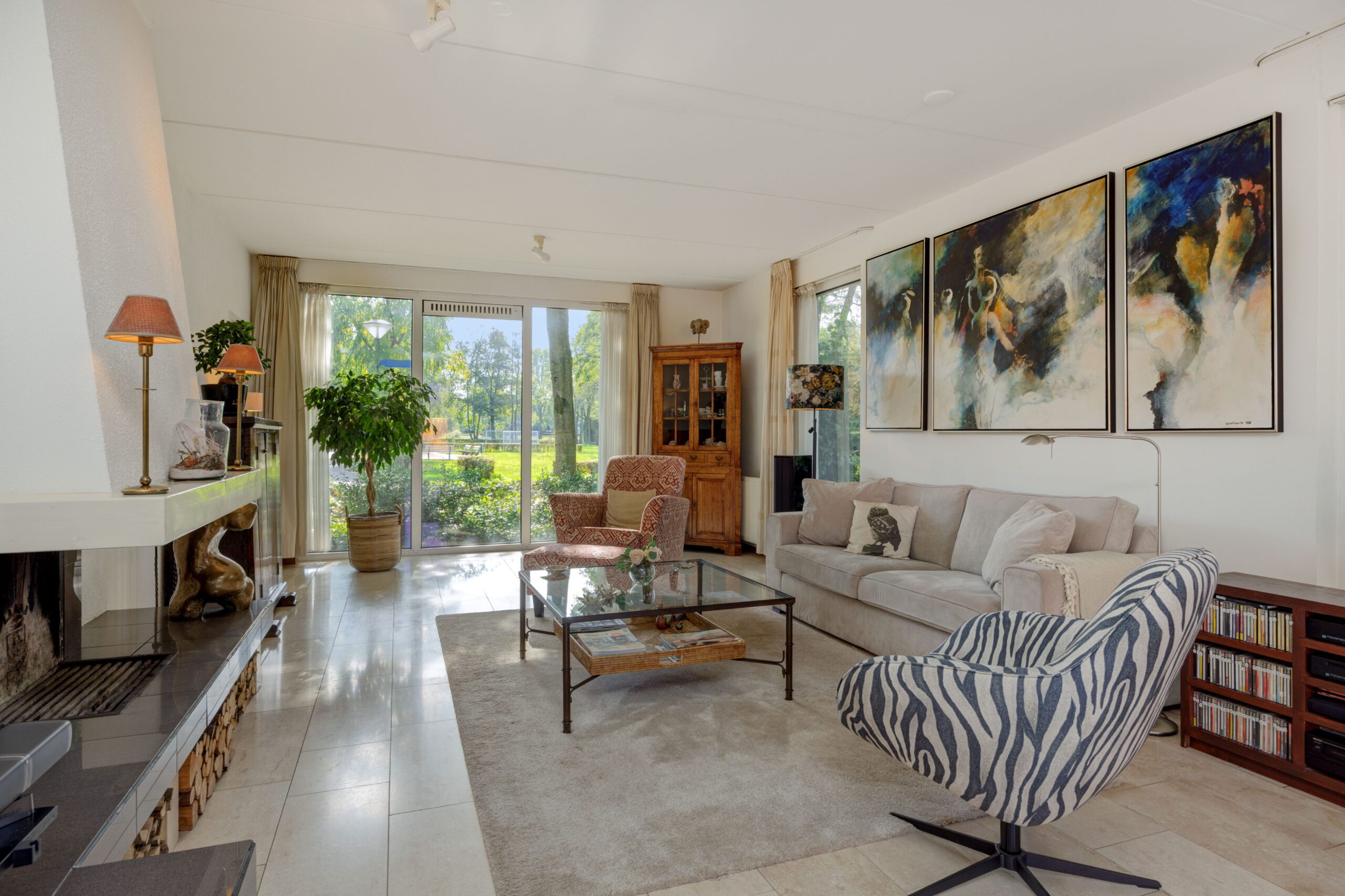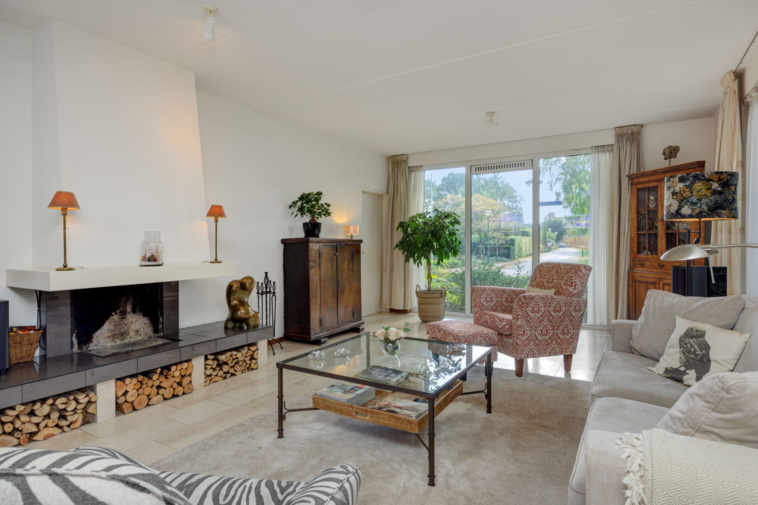– Grote, lichte woonkamer met sfeervolle open haard en openslaande deuren naar de tuin.