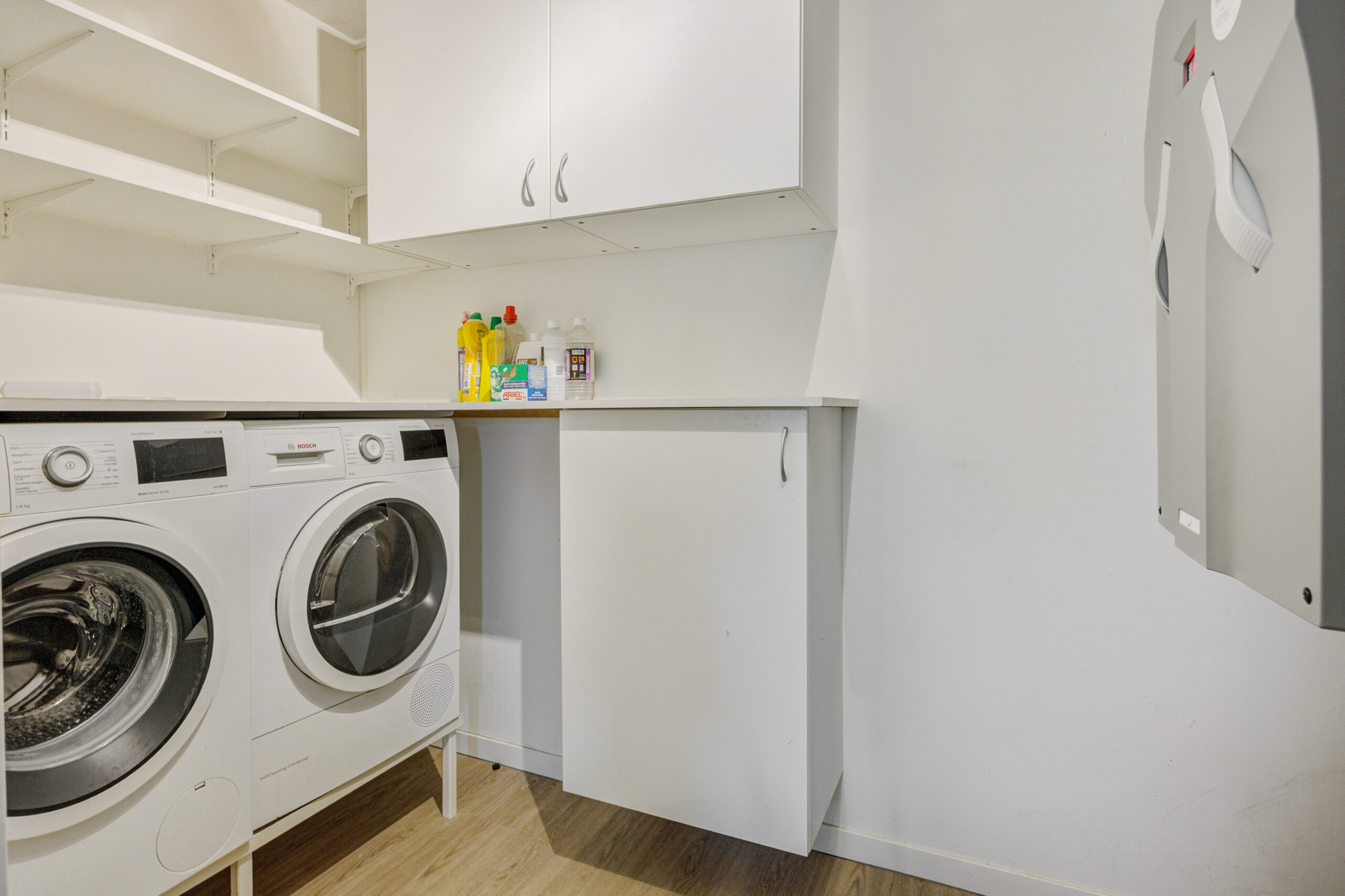 – Bergruimte met aansluitingen voor de wasmachine en droger.