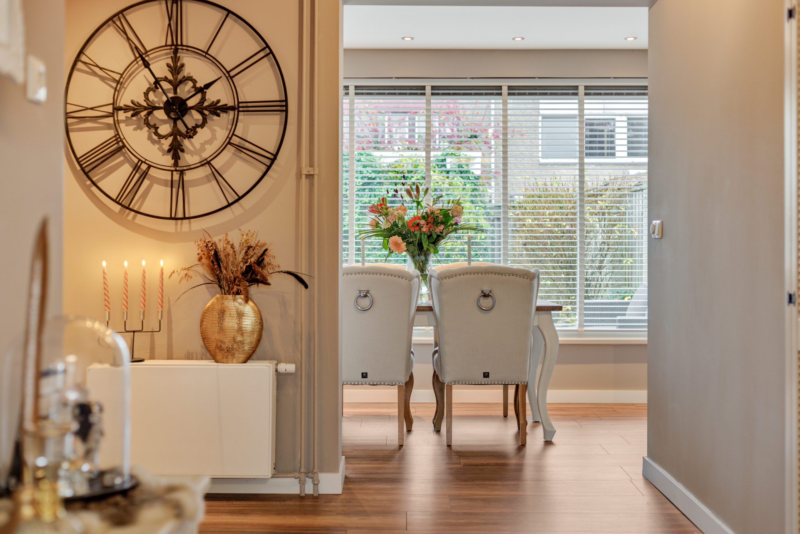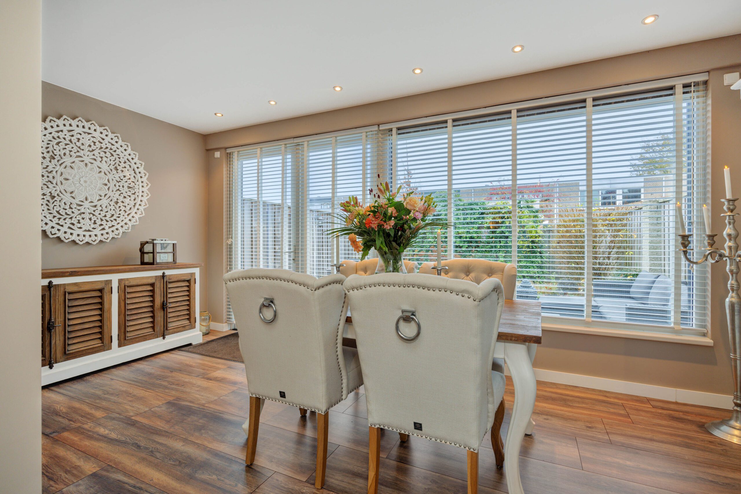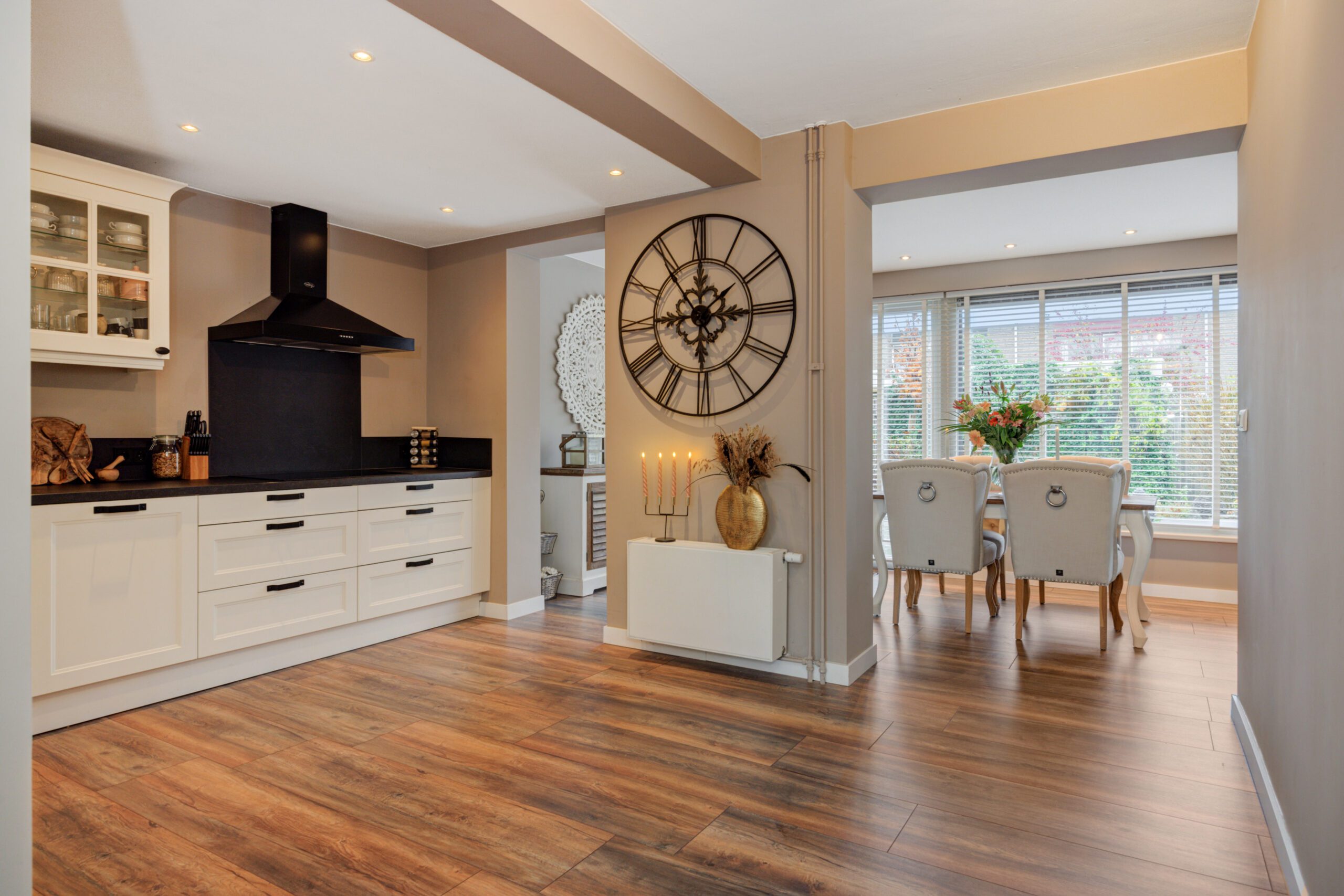 Aan de Ruusbroecgaarde 117 staat een verrassend ruime tussenwoning die door de grote uitbouw aan de achterzijde een heerlijke leefruimte heeft gekregen. De lichte eetkamer, met brede raampartijen en uitzicht op de tuin, is zo’n plek waar je vanzelf wat langer blijft zitten. Of dat nu is voor het ontbijt, een gezellige avond met vrienden of een rustig moment voor jezelf en een kop warme thee.