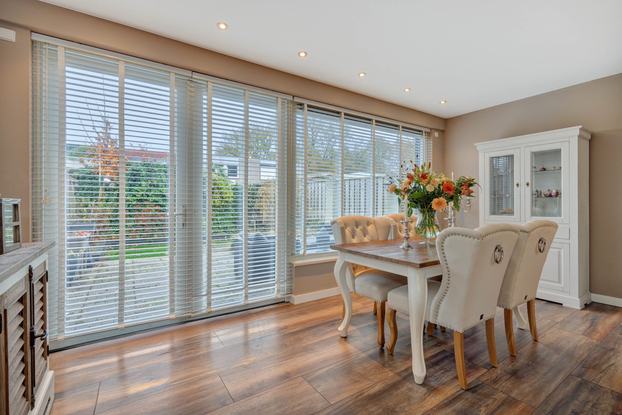 – Uitgebouwde eetkamer met grote raampartijen en loopdeuren naar de tuin.