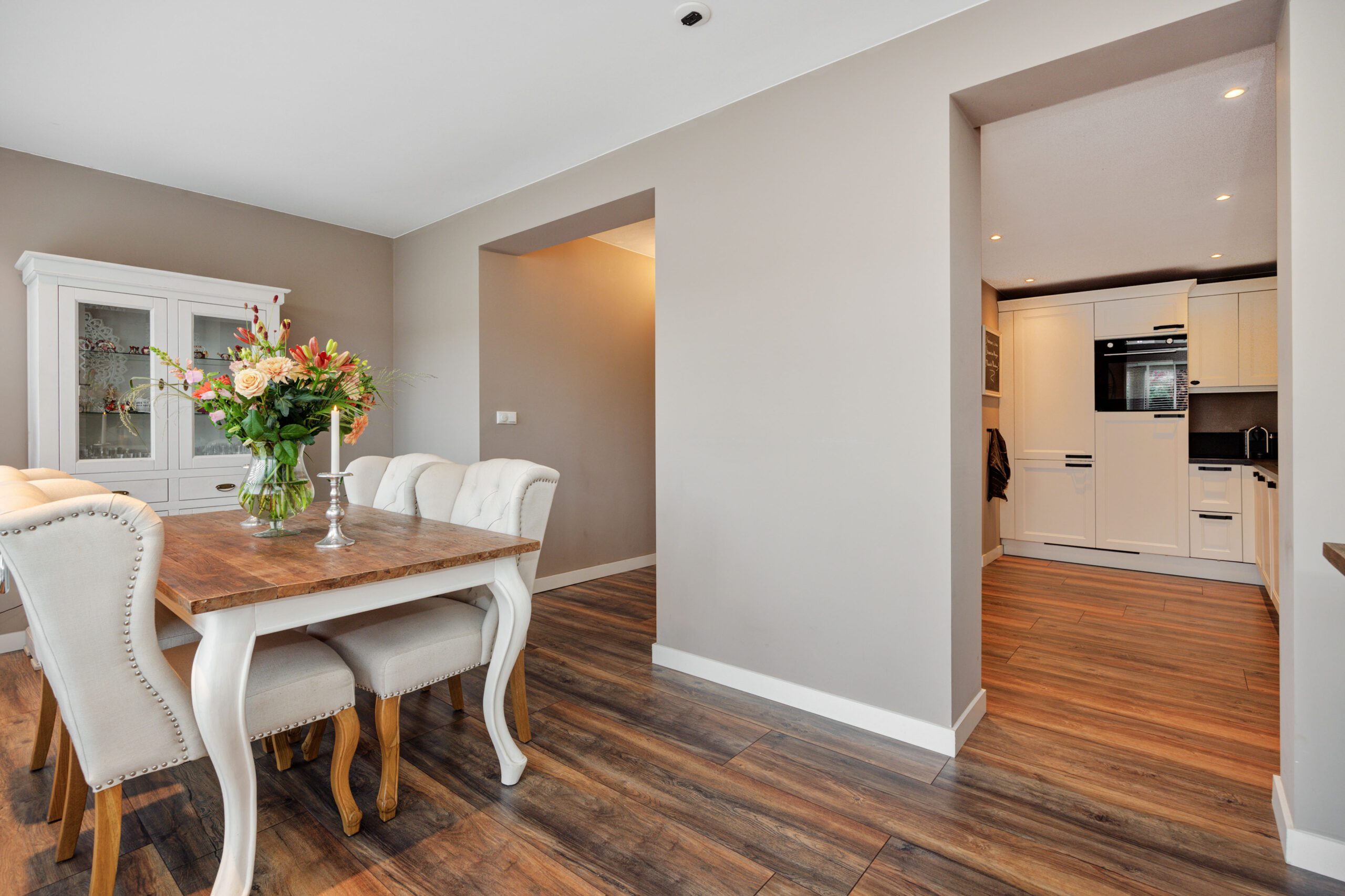 De indeling op de begane grond is praktisch en logisch. De moderne woonkamer, de open keuken en de grote eetkamer lopen mooi in elkaar over en zorgen voor een ruimtelijk gevoel. Daarnaast is er een handige sanitaire ruimte die de woning ook toekomstbestendig maakt. Boven vind je vier slaapkamers, waarvan één nu is ingericht als walk in closet. Door de nieuwe laminaatvloer en het strakke stuukwerk oogt alles fris, licht en helemaal van deze tijd.