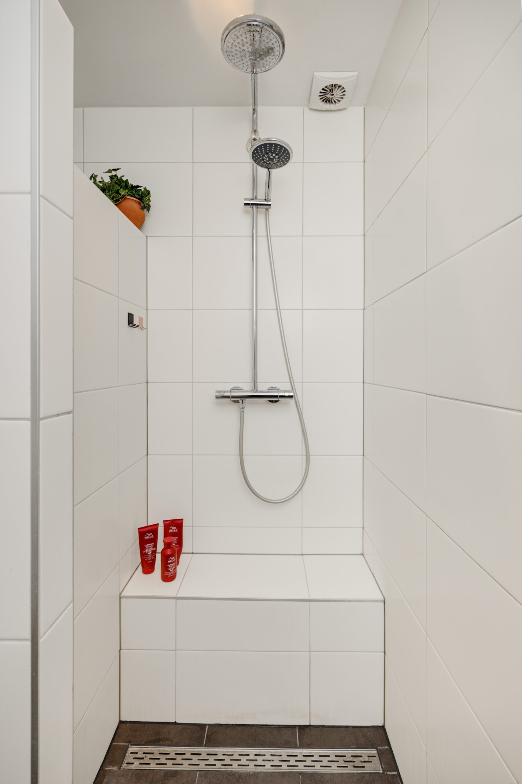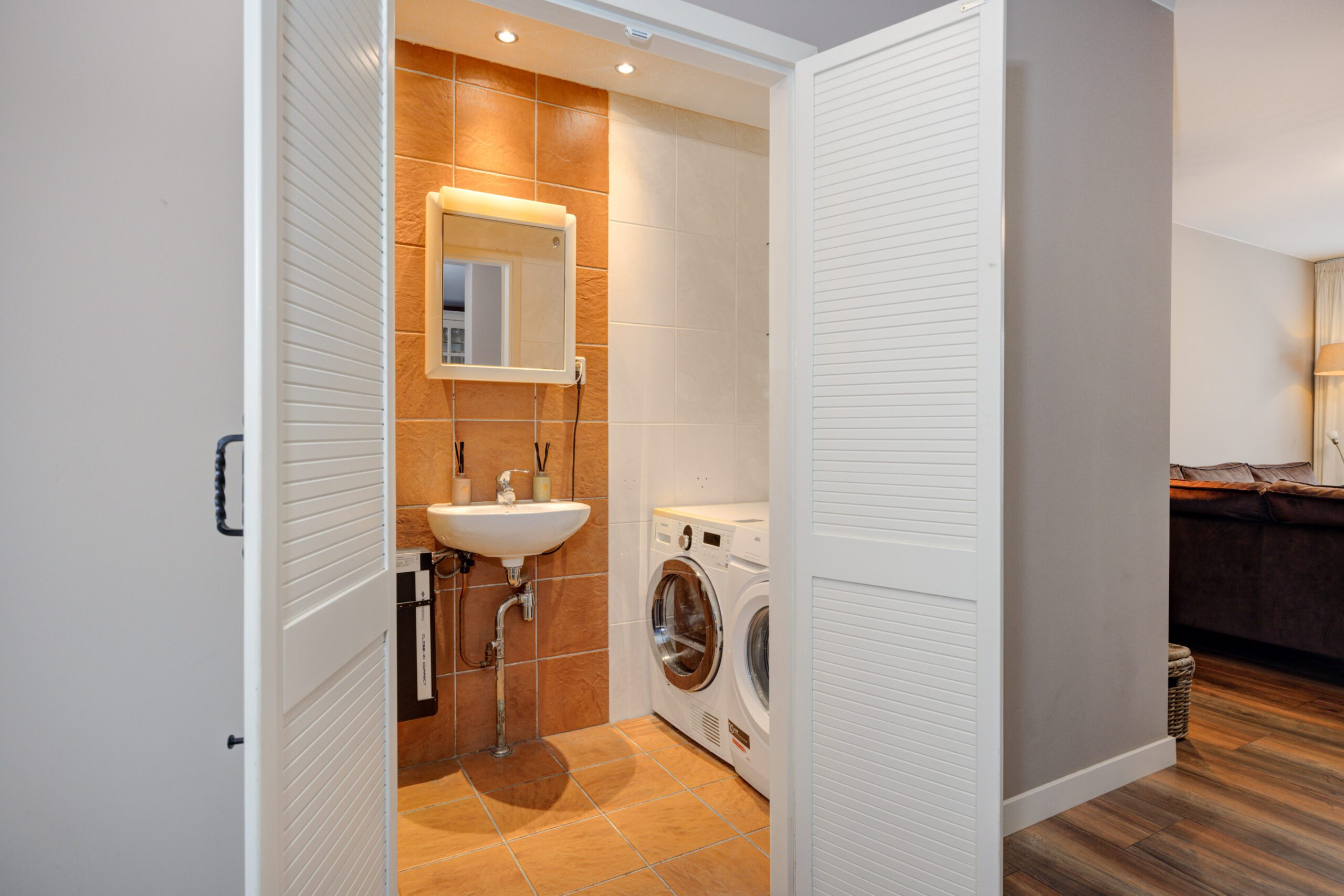 – Wasruimte met douche, wastafel en aansluitingen voor de wasmachine en droger.
