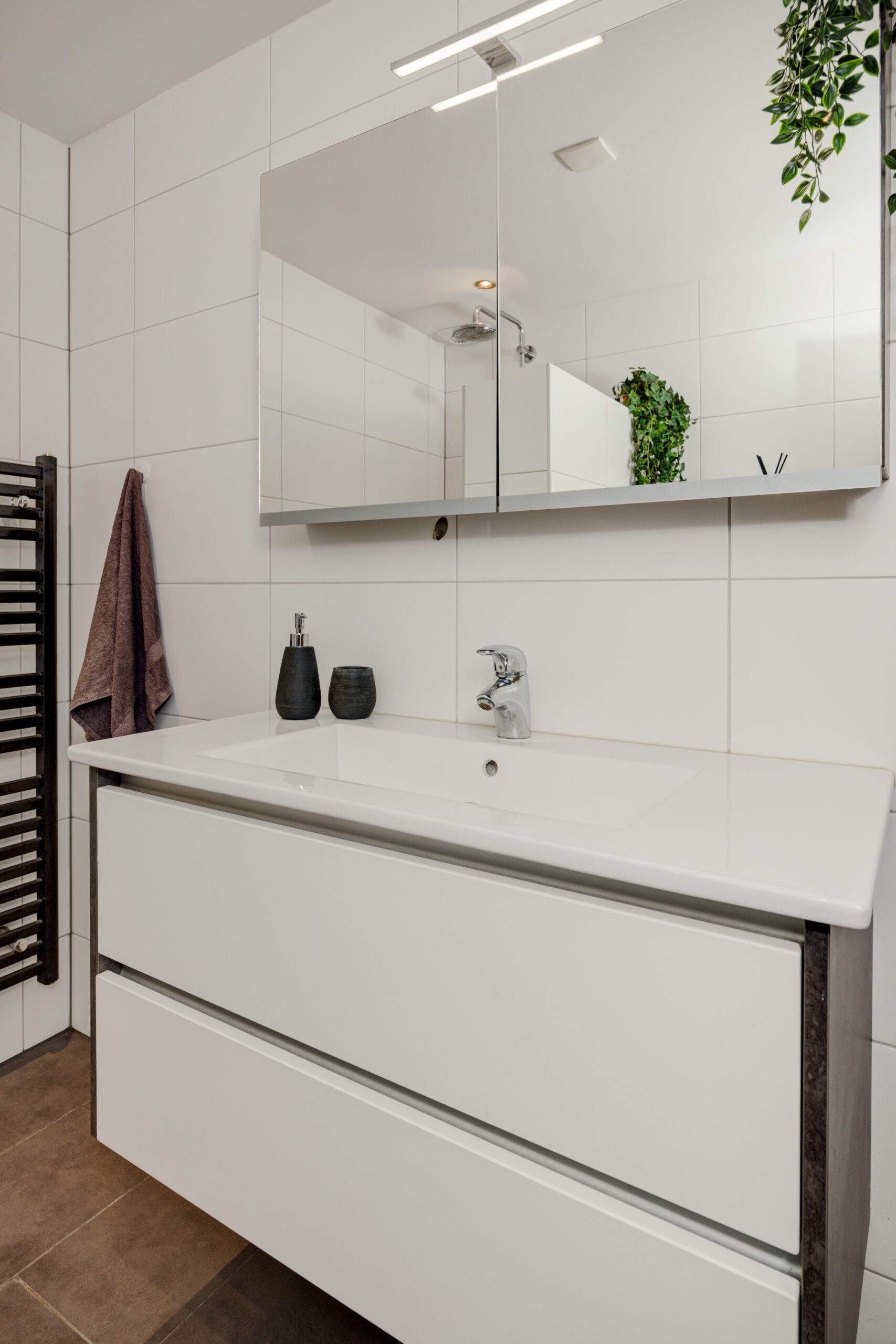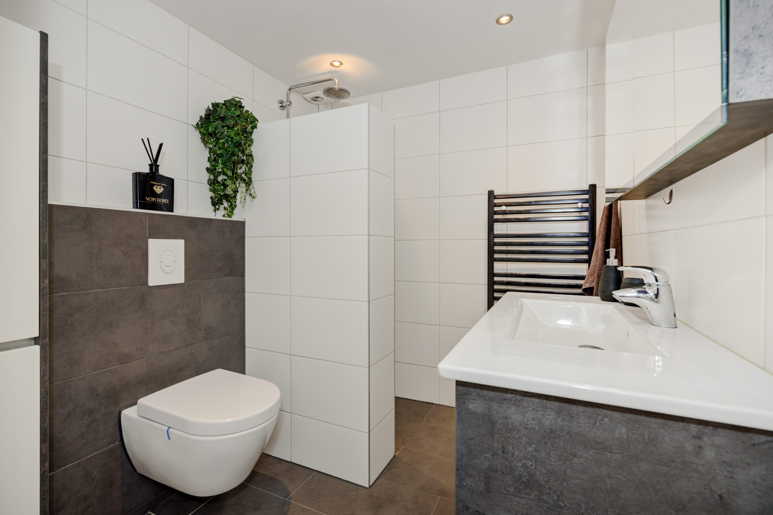 – Moderne badkamer met toilet, inloopdouche, wastafelmeubel en designradiator.