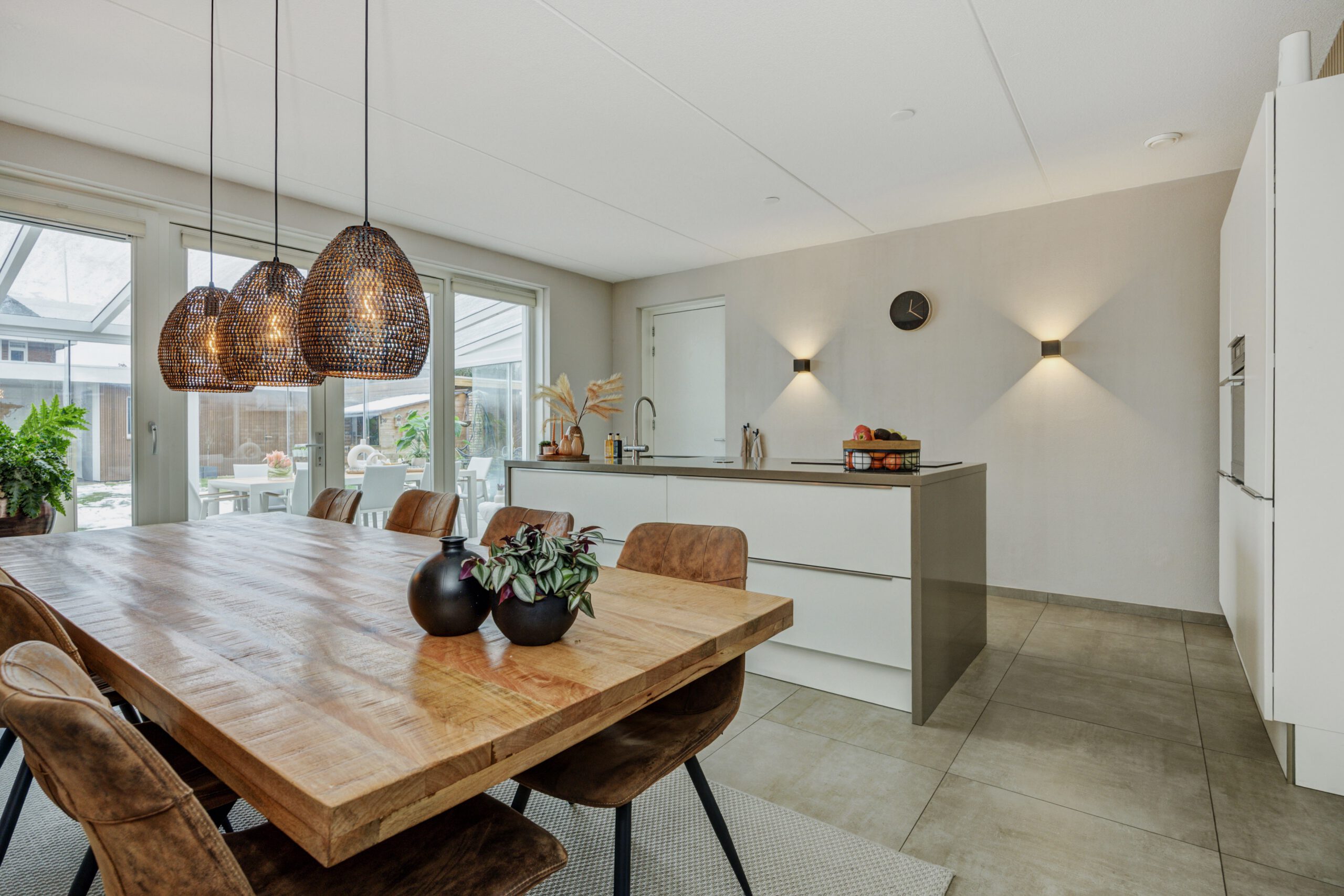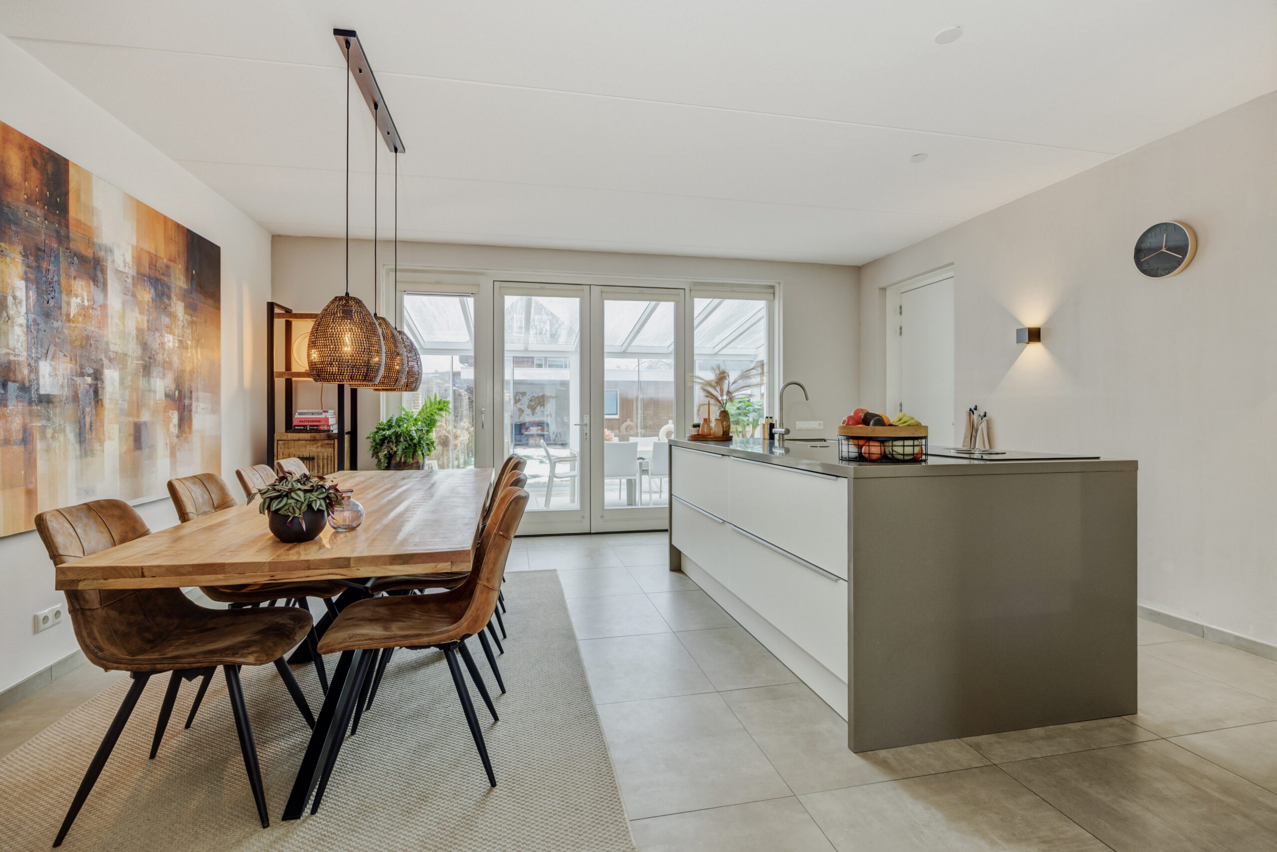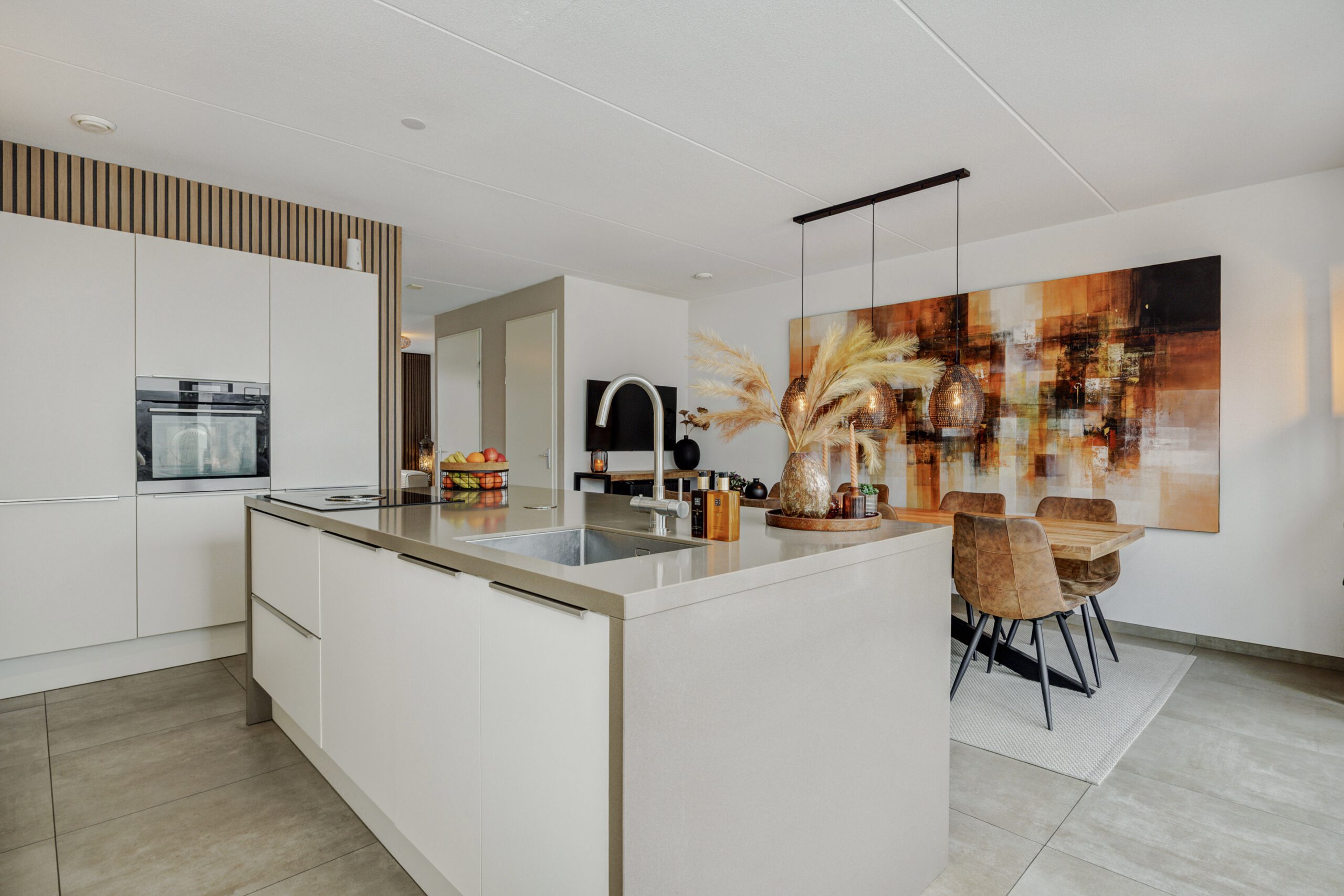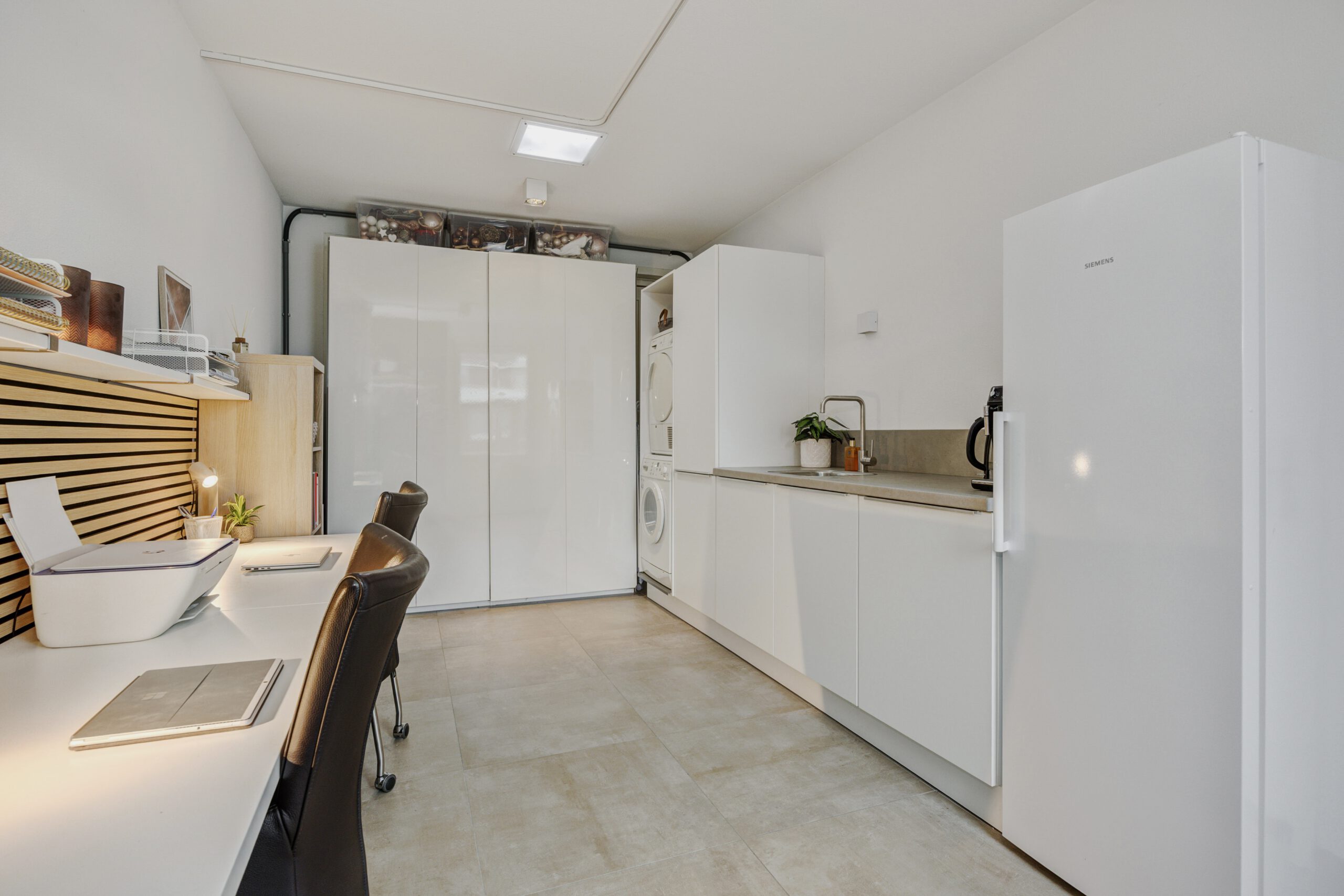 Bij binnenkomst zijn het de ruimtes en het hoge afwerkingsniveau die direct de aandacht trekken. De woonkamer is heerlijk ruim en biedt plaats aan een comfortabele zithoek. Aansluitend bevindt zich de woonkeuken, die dankzij de tuinkamer aan de achterzijde een prachtige lichtinval heeft. Dit is echt een fijne plek voor lange diners en gezellig samenzijn. De keuken is luxe uitgevoerd en beschikt over een kookeiland, een kastenwand en een praktische provisiekast. De gehele begane grond is voorzien van vloerverwarming, wat zorgt voor extra comfort. De voormalige garage is inpandig bereikbaar en momenteel in gebruik als multifunctionele ruimte. Deze ruimte leent zich uitstekend als kantoor, speelkamer of hobbyruimte, maar kan desgewenst ook weer eenvoudig als garage worden gebruikt.