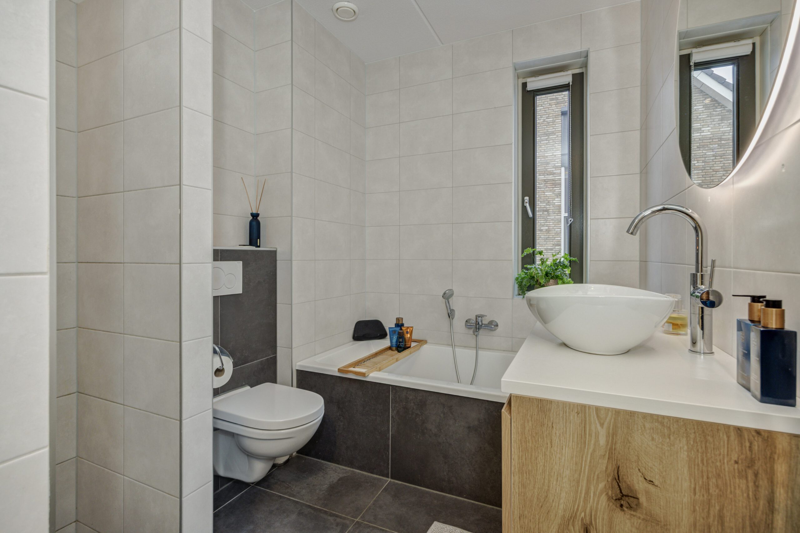 – Luxe badkamer met toilet, ligbad, inloopdouche en wastafelmeubel.
