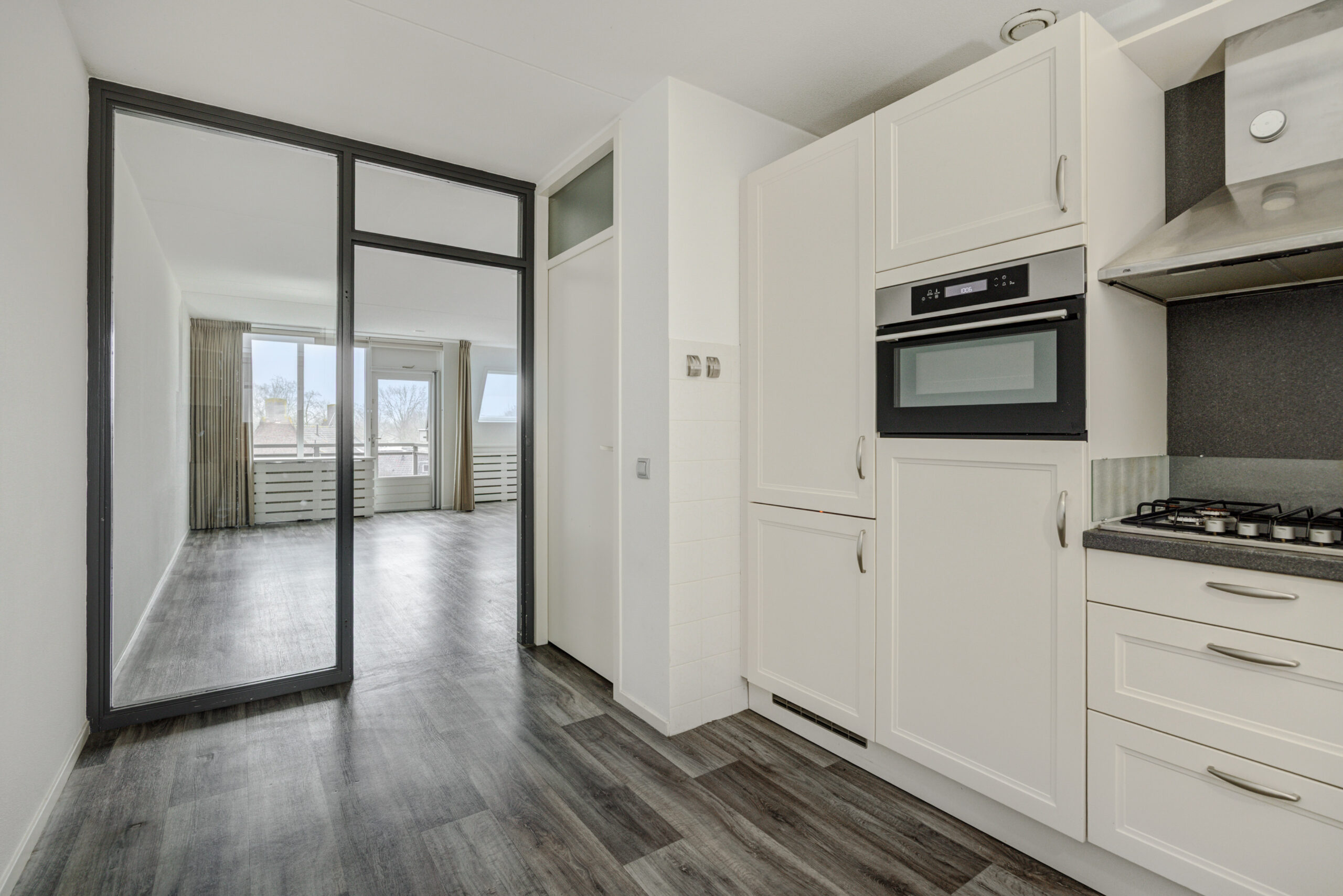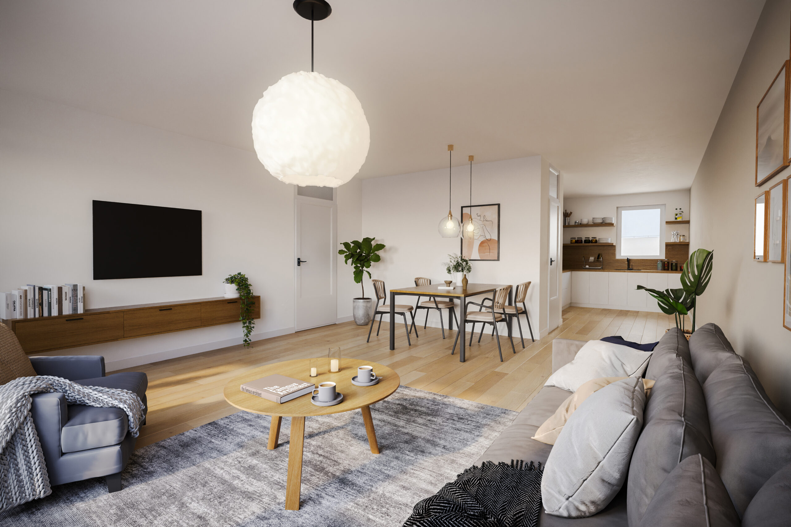 Dit ruime appartement mét lift is gelegen op de bovenste verdieping van het appartementencomplex ’t Hoogh. De royale woonkamer is dankzij de fijne raampartijen heerlijk licht en biedt volop ruimte voor zowel een comfortabele zithoek als een gezellige eethoek. De keuken grenst aan de woonkamer en beschikt over voldoende werk- en bergruimte. Het keukenblok is voorzien van een koelkast, vaatwasser, combioven en een 4-pits gaskookplaat met afzuigkap. In de berging bevinden zich de aansluitingen voor de wasmachine en droger. Wie liever een open leefruimte wil creëren, kan het kozijn tussen de woonkamer en de keuken eenvoudig verwijderen. Om je een idee te geven hoe dit eruit zou kunnen zien, hebben wij een artist impression laten maken. Prachtig toch? Deze artist impression dient enkel als inspiratie; er kunnen geen rechten aan worden ontleend.