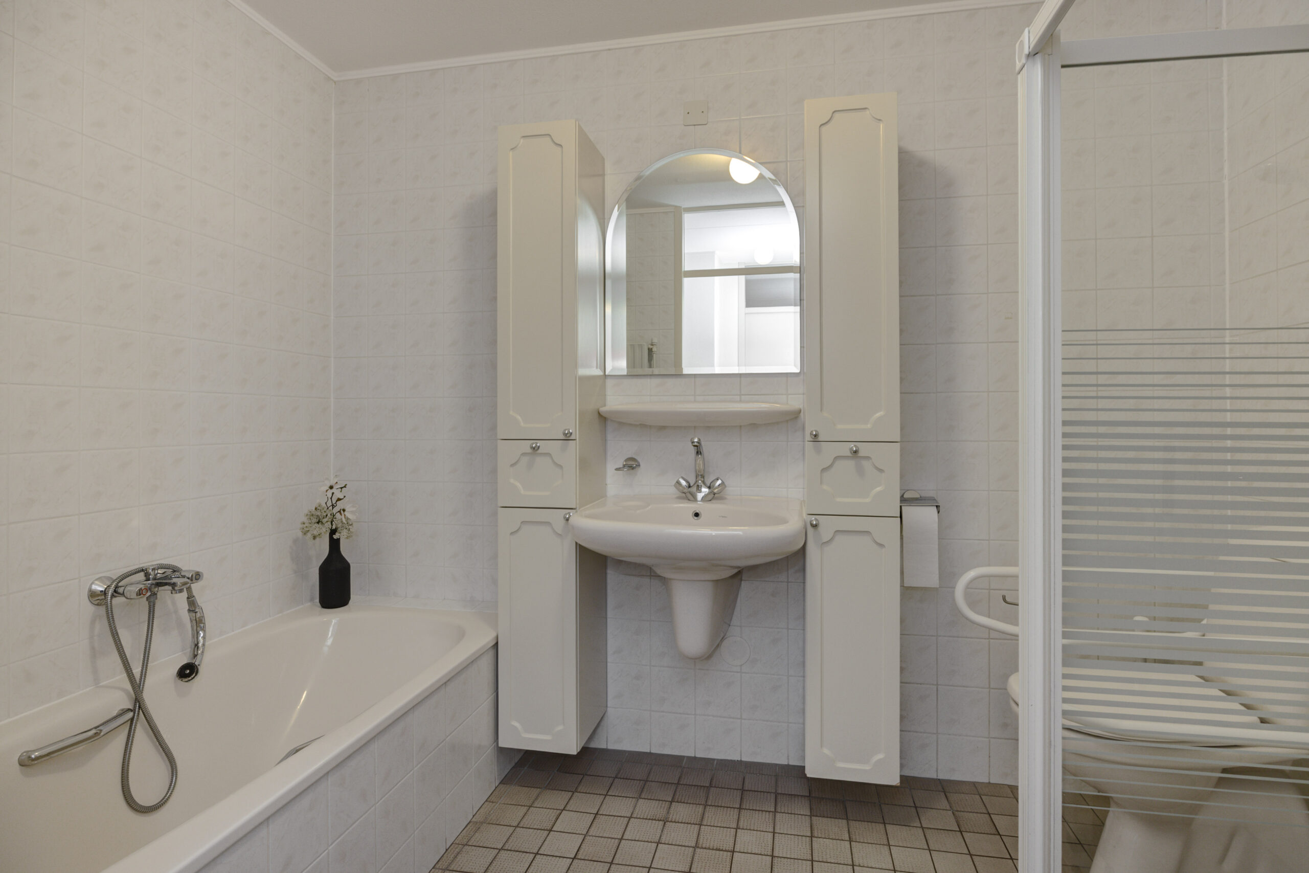 – Badkamer met toilet, inloopdouche, ligbad en wastafel.