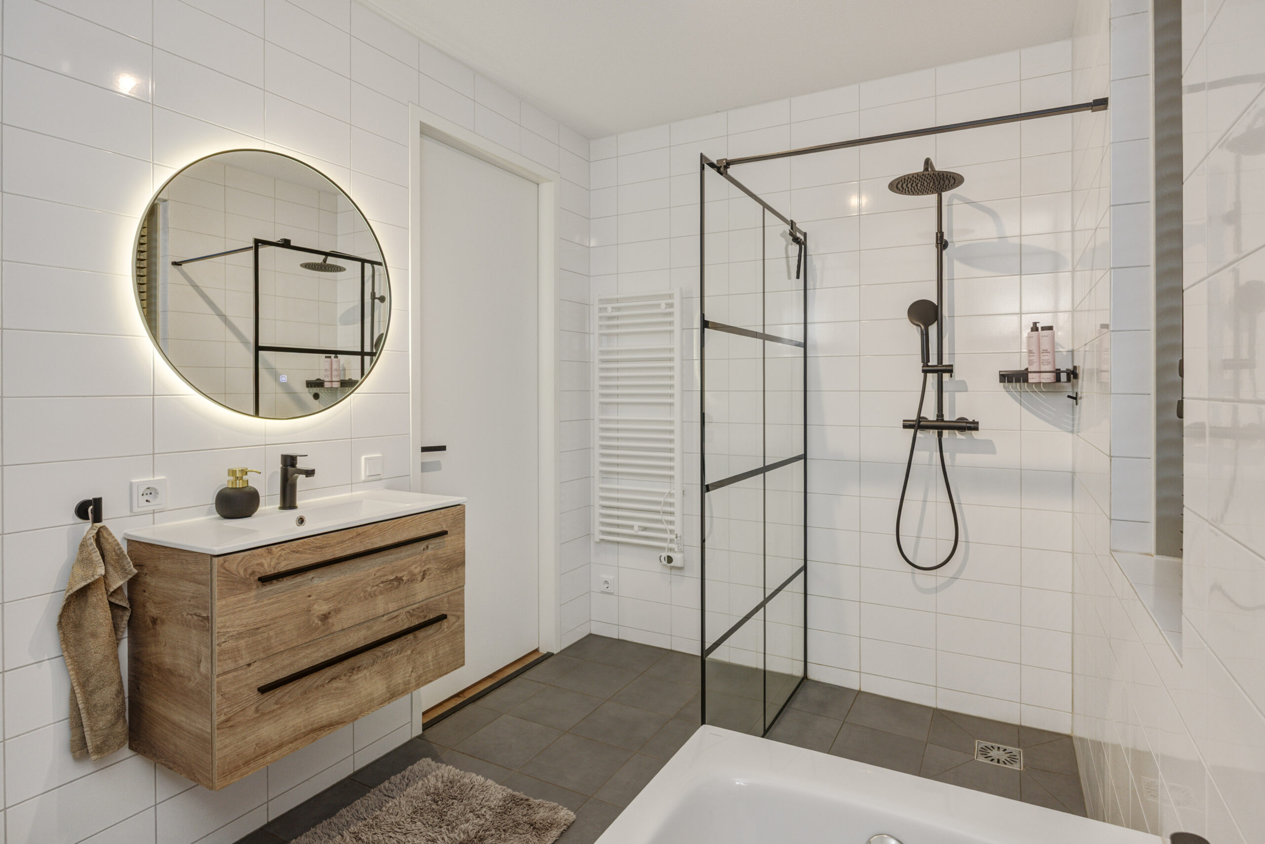 – Schitterende badkamer (2023) met toilet, douche, bad, wastafelmeubel en designradiator.